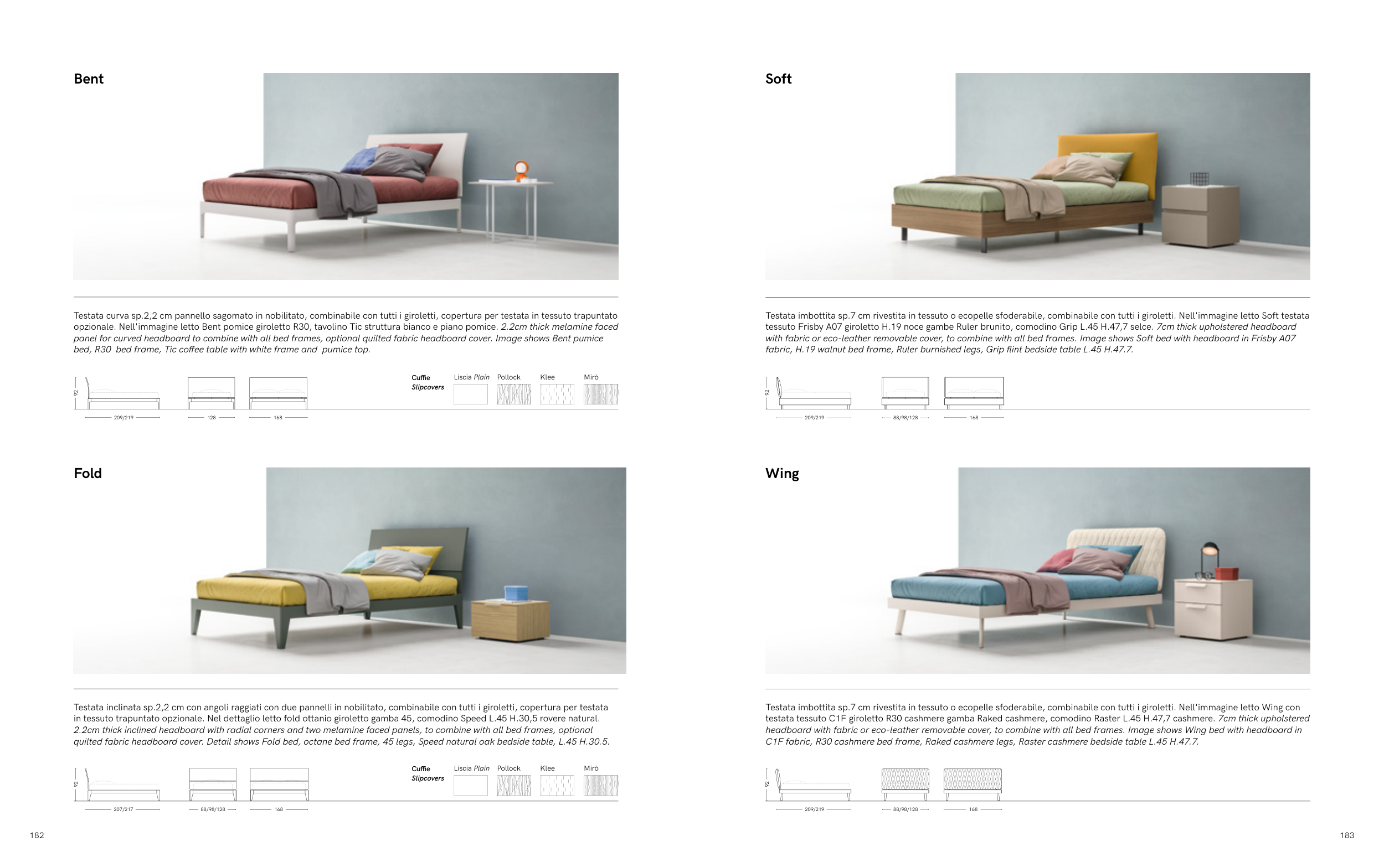 Testata imbottita sp.7 cm rivestita in tessuto o ecopelle sfoderabile, combinabile con tutti i giroletti. Nell'immagine letto Wing con