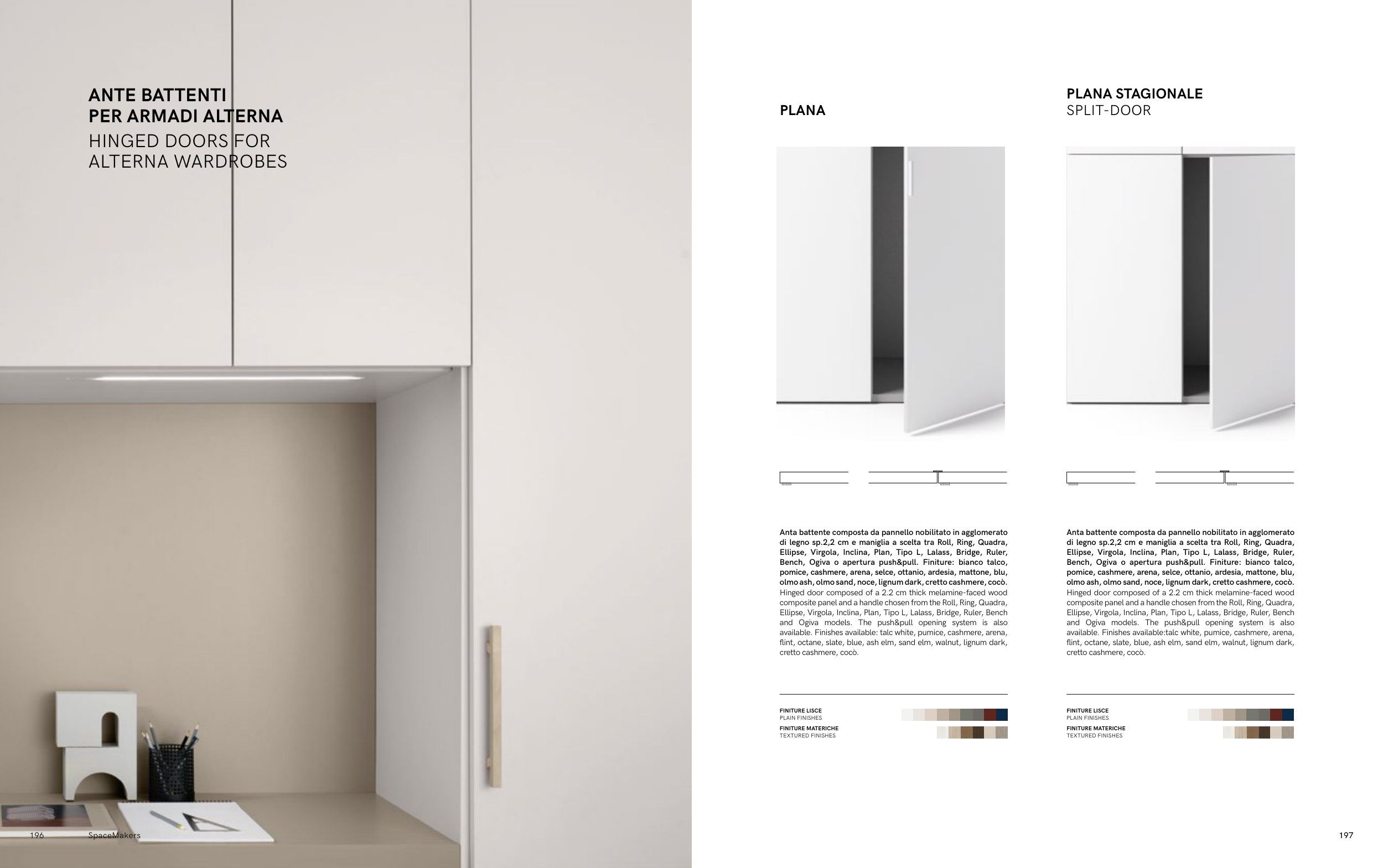 olmo ash, olmo sand, noce, lignum dark, cretto cashmere, cocò.