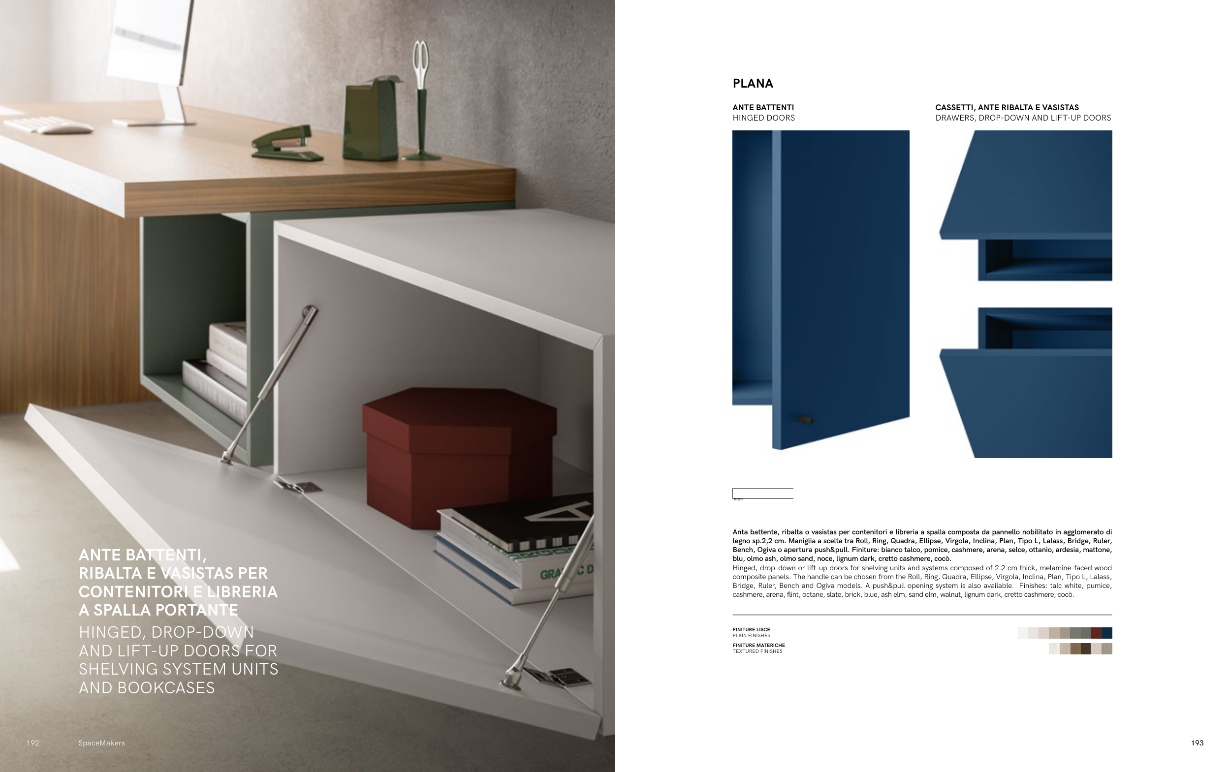 Bench, Ogiva o apertura push&pull. Finiture: bianco talco, pomice, cashmere, arena, selce, ottanio, ardesia, mattone,