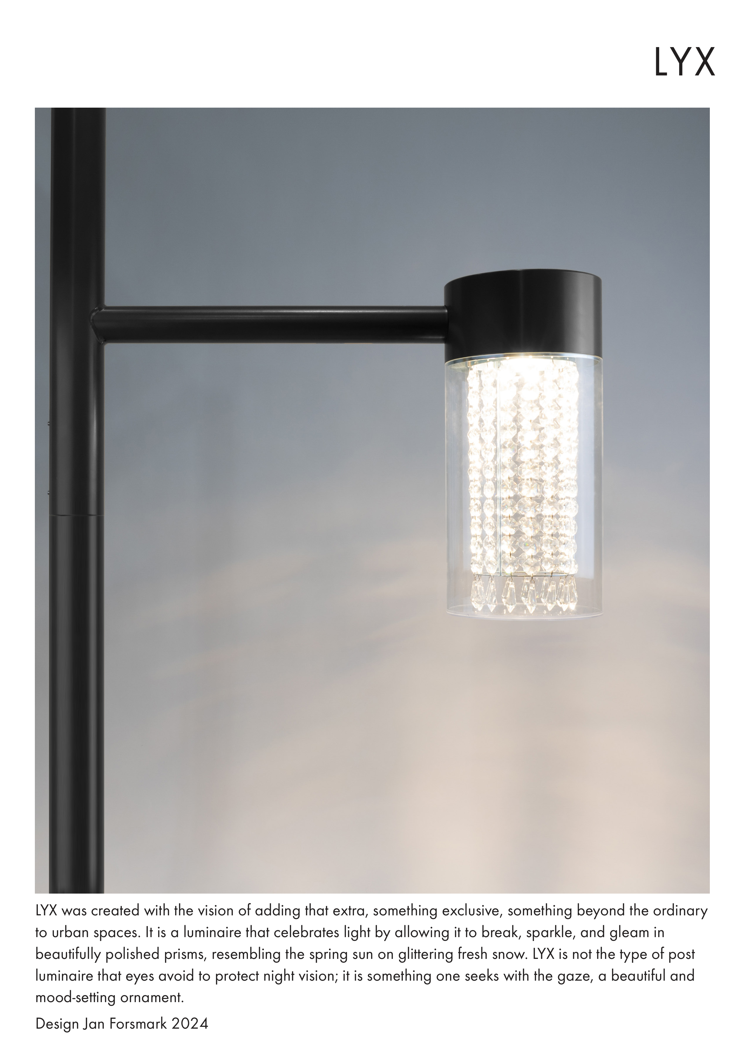 to urban spaces. It is a luminaire that celebrates light by allowing it to break, sparkle, and gleam in