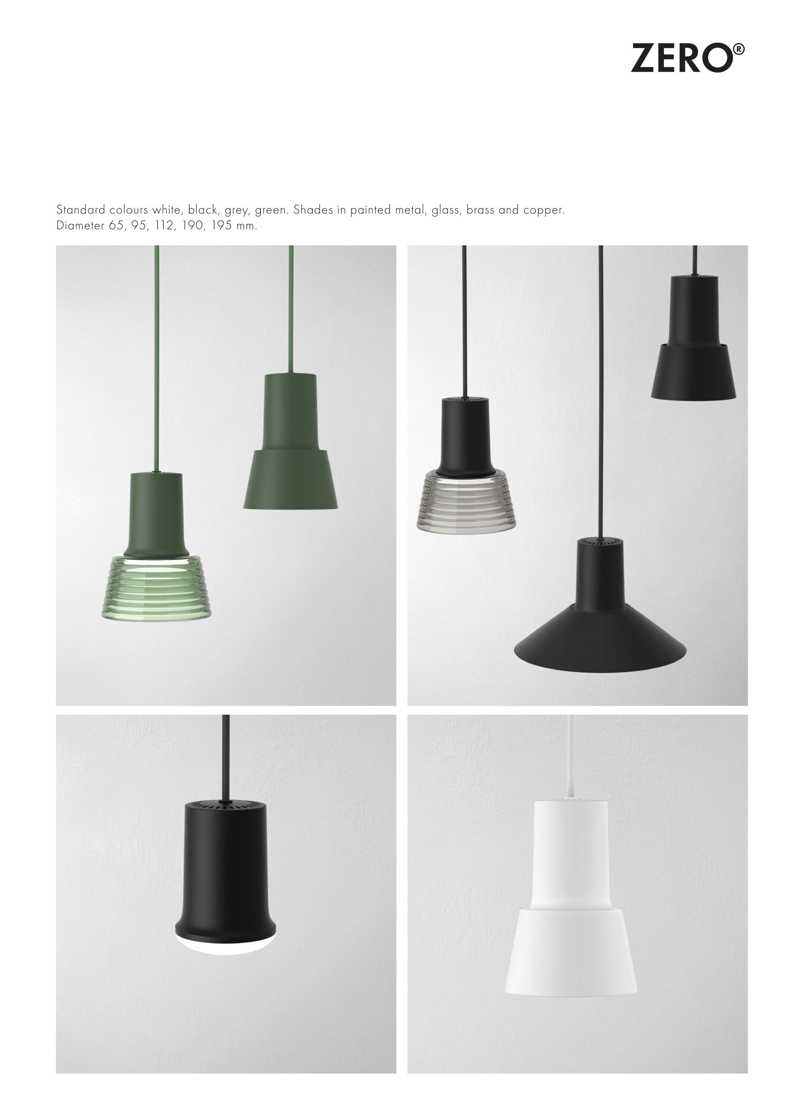 Standard colours white, black, grey, green. Shades in painted metal, glass, brass and copper.