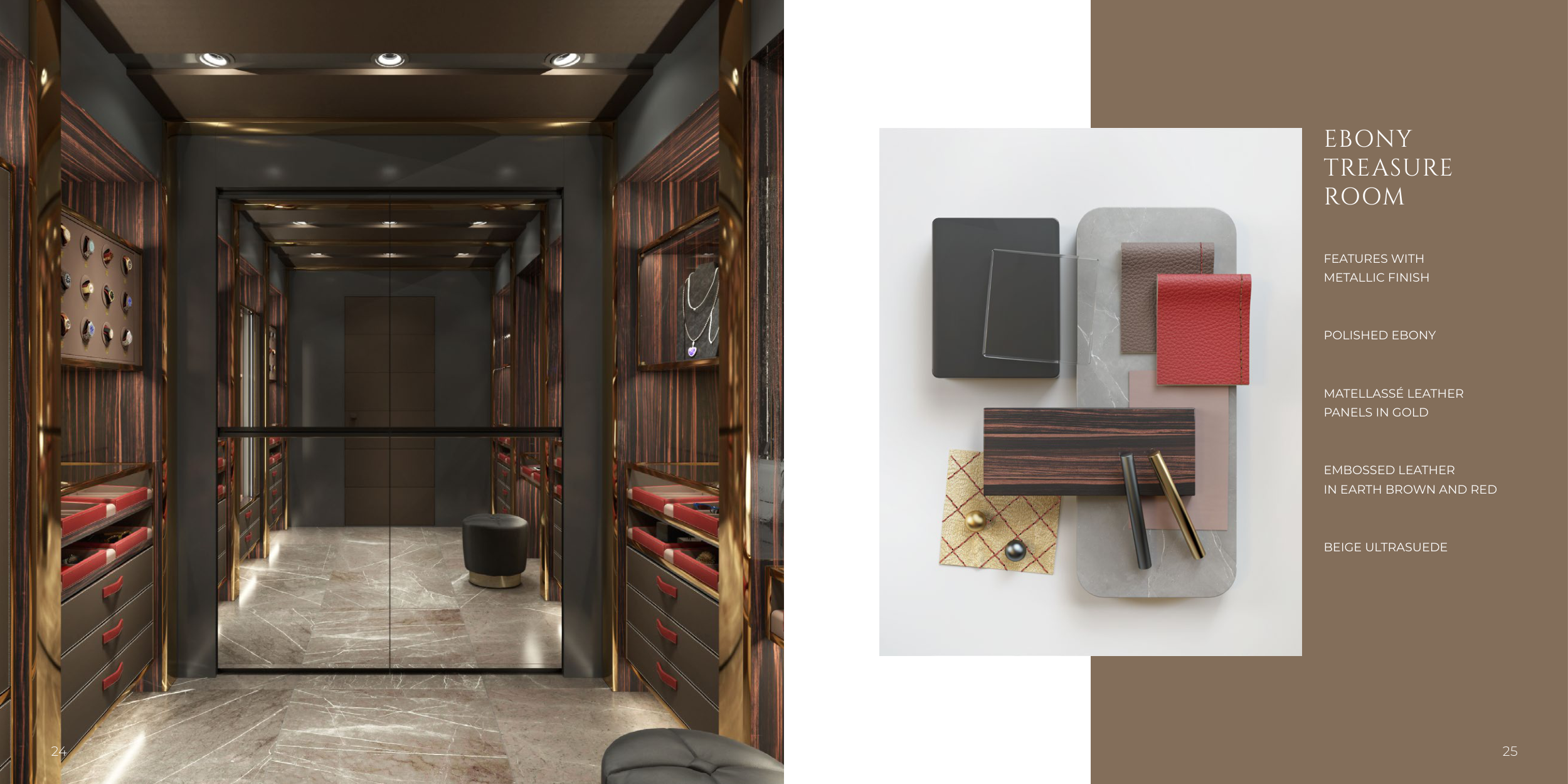 FEATURES WITH METALLIC FINISH POLISHED EBONY MATELLASSÉ LEATHER PANELS IN GOLD EMBOSSED LEATHER IN EARTH BROWN AND RED BEIGE ULTRASUEDE EBONY TREASURE ROOM 24 25