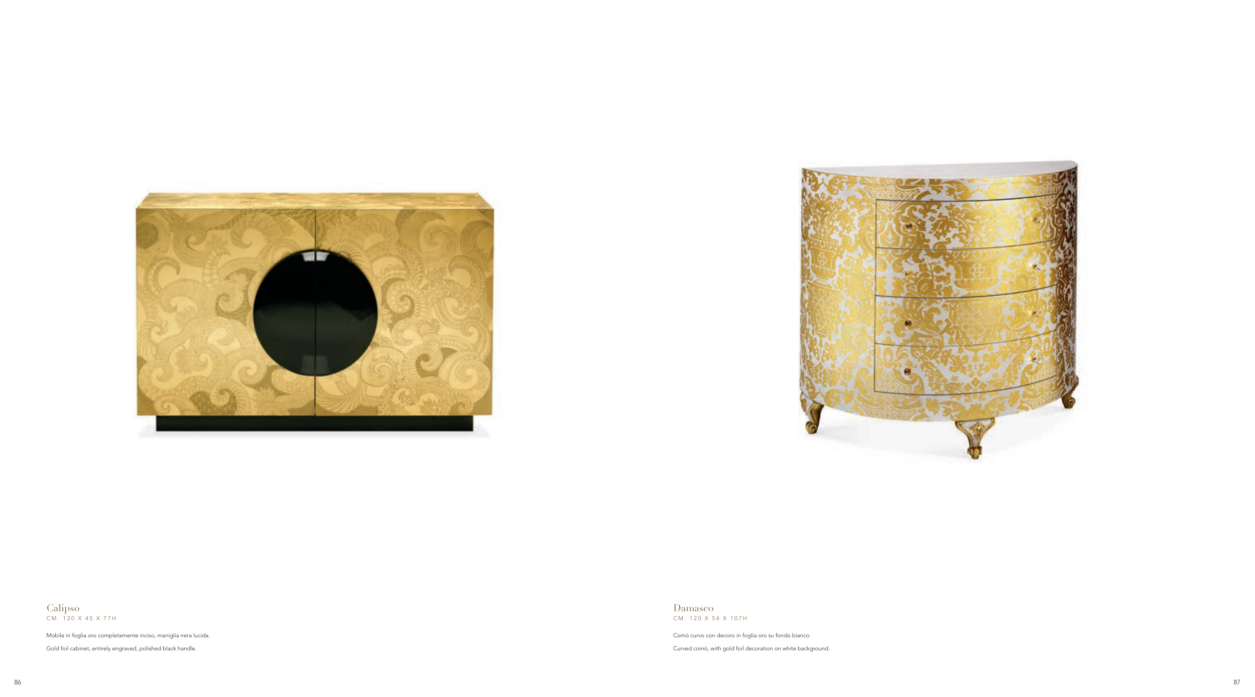 Curved comò, with gold foil decoration on white background.
