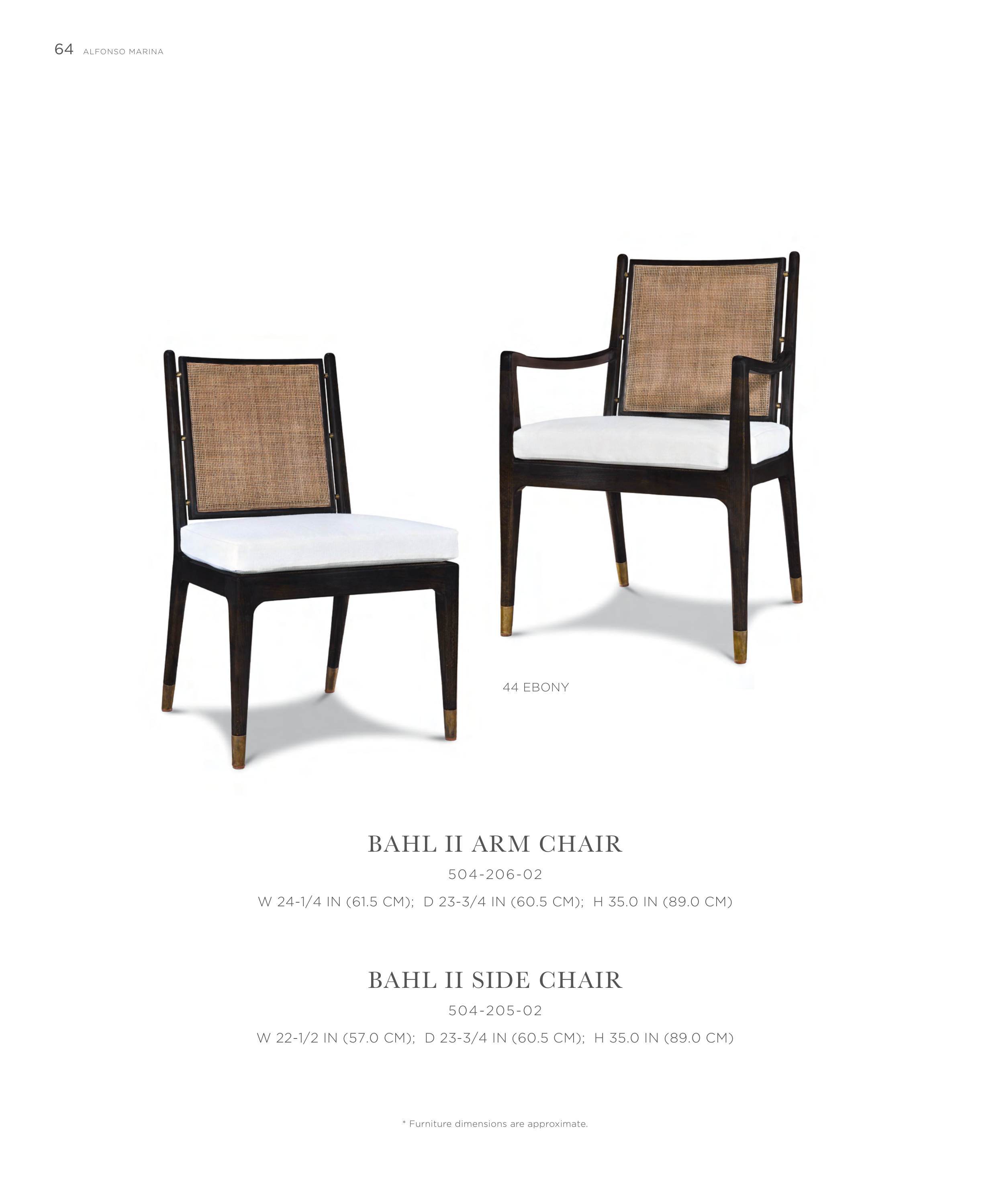 64 ALFONSO MARINA * Furniture dimensions are approximate. BAHL II ARM CHAIR 504-206-02 W 24-1/4 IN (61.5 CM); D 23-3/4 IN (60.5 CM); H 35.0 IN (89.0 CM) BAHL II SIDE CHAIR 504-205-02 W 22-1/2 IN (57.0 CM); D 23-3/4 IN (60.5 CM); H 35.0 IN (89.0 CM) 44 EBONY