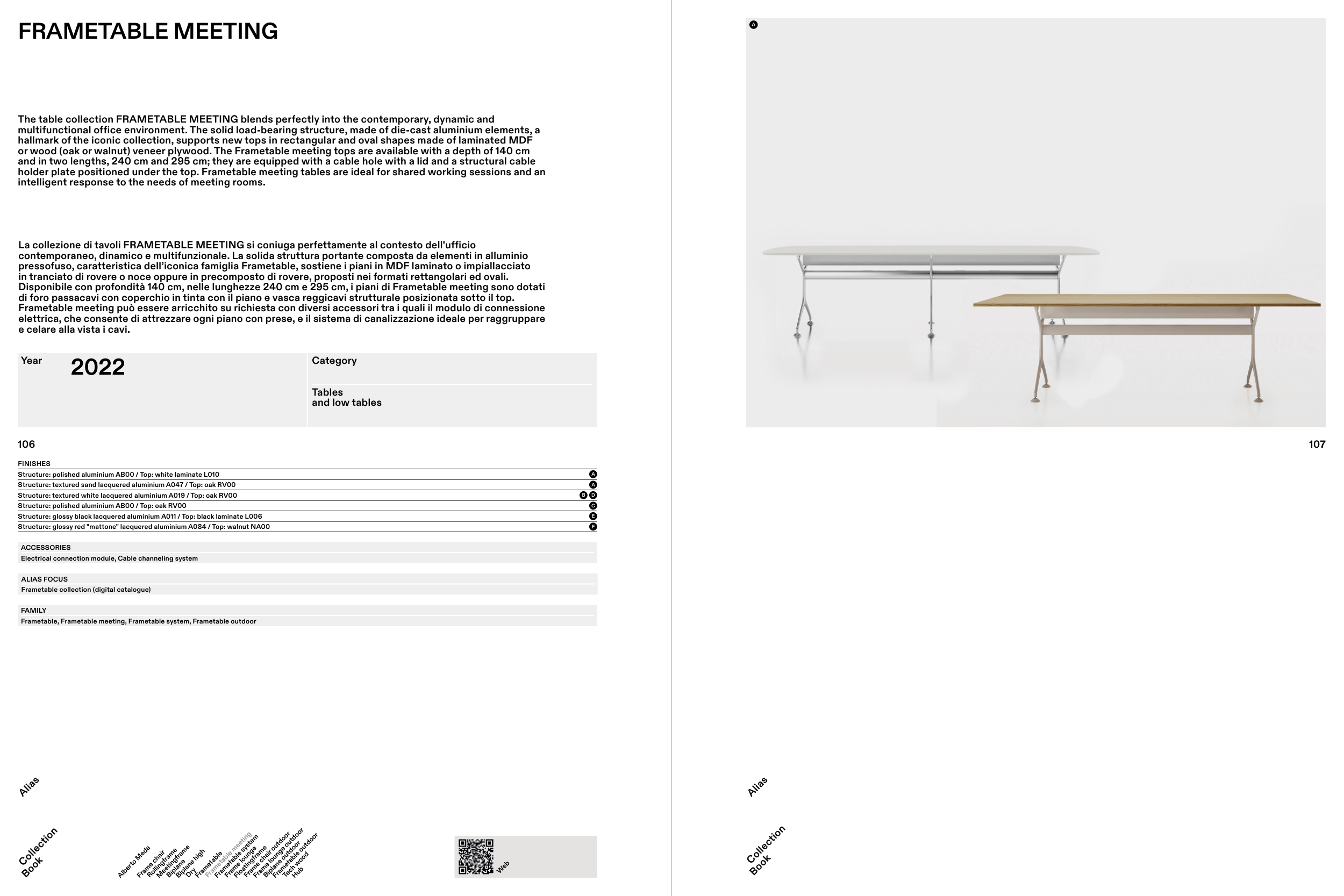 pressofuso, caratteristica dell’iconica famiglia Frametable, sostiene i piani in MDF laminato o impiallacciato