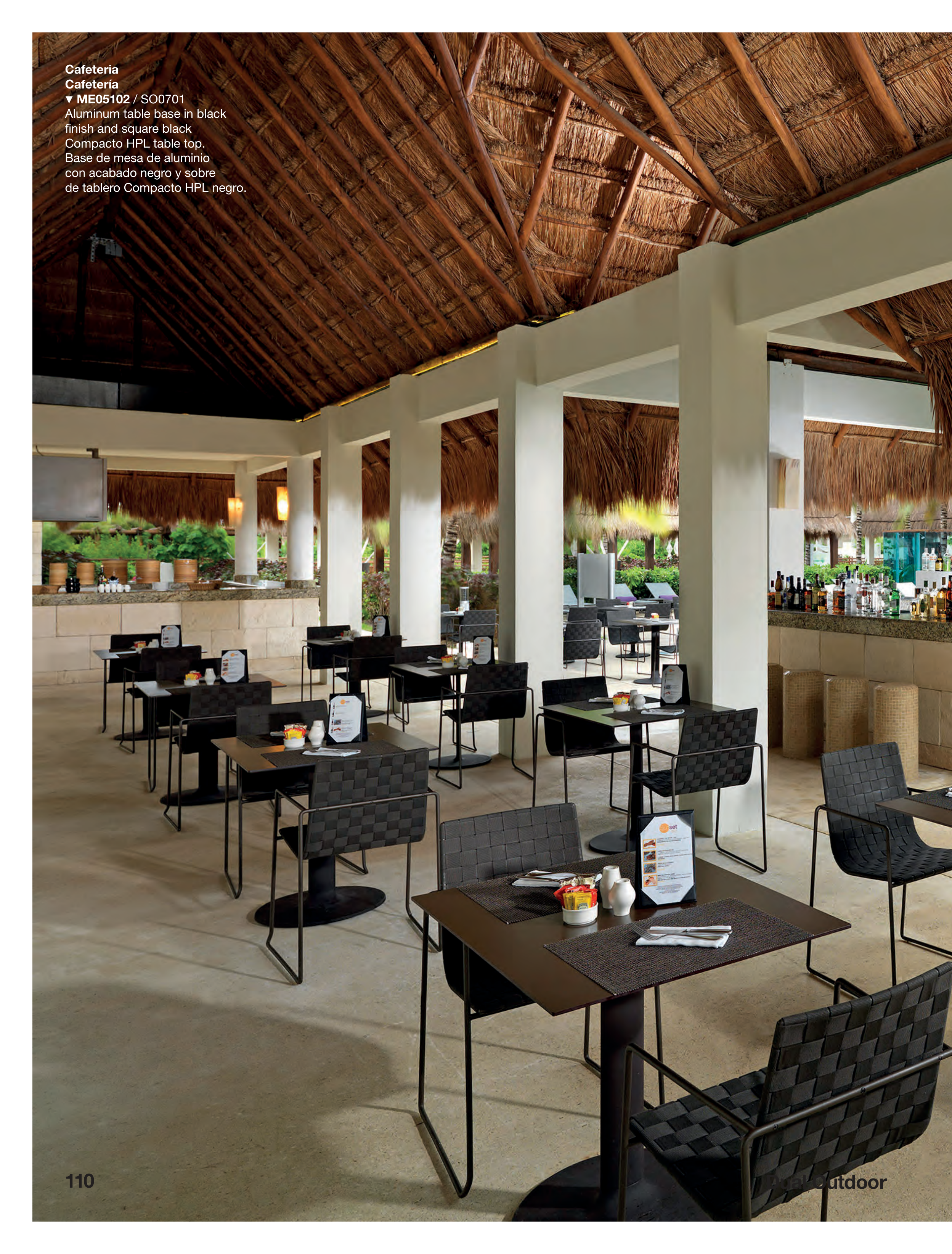 Dual Outdoor 110 Cafeteria Cafetería . ME05102 / SO0701 Aluminum table base in black finish and square black Compacto HPL table top. Base de mesa de aluminio con acabado negro y sobre de tablero Compacto HPL negro.