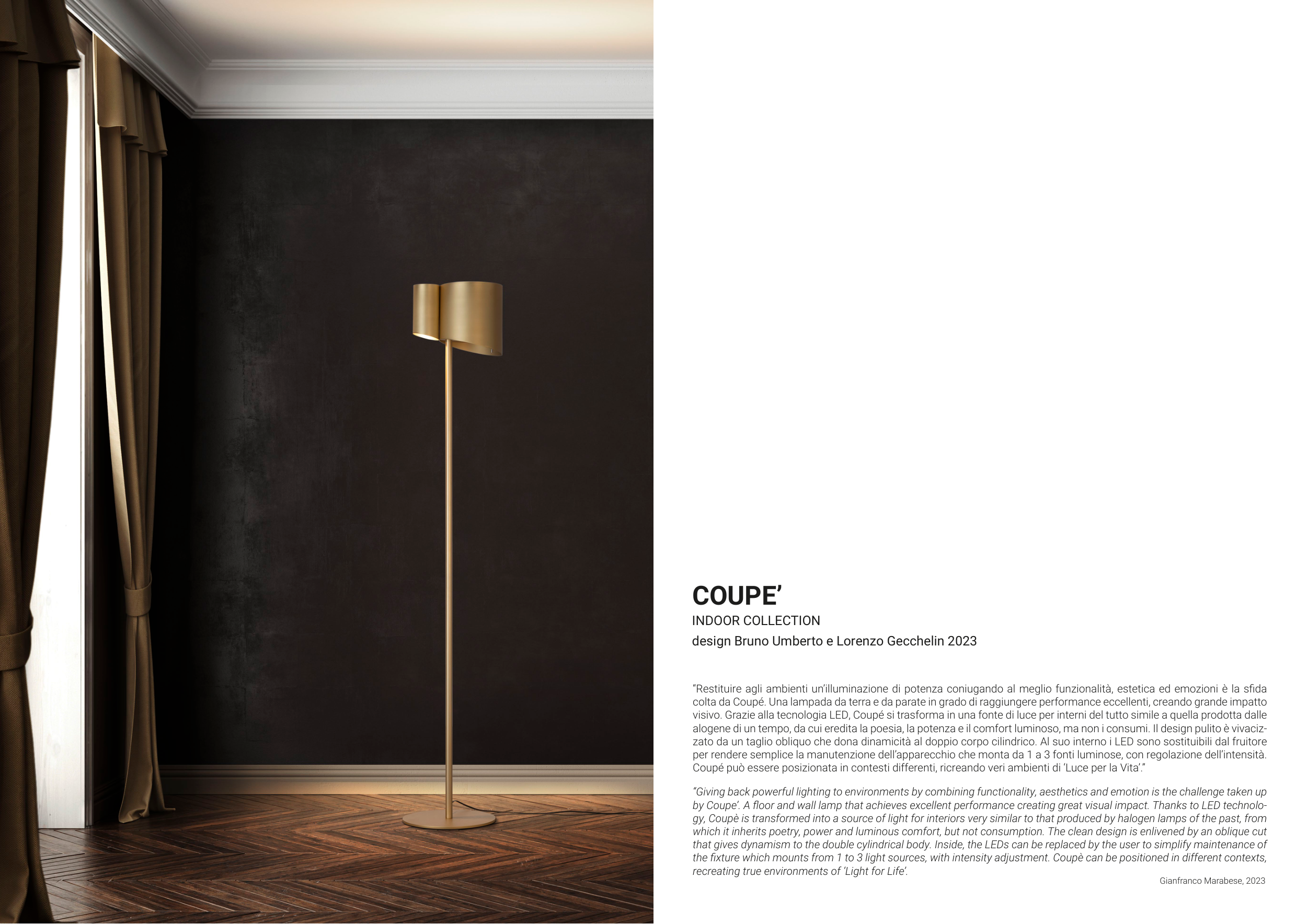 by Coupe’. A floor and wall lamp that achieves excellent performance creating great visual impact. Thanks to LED technolo-