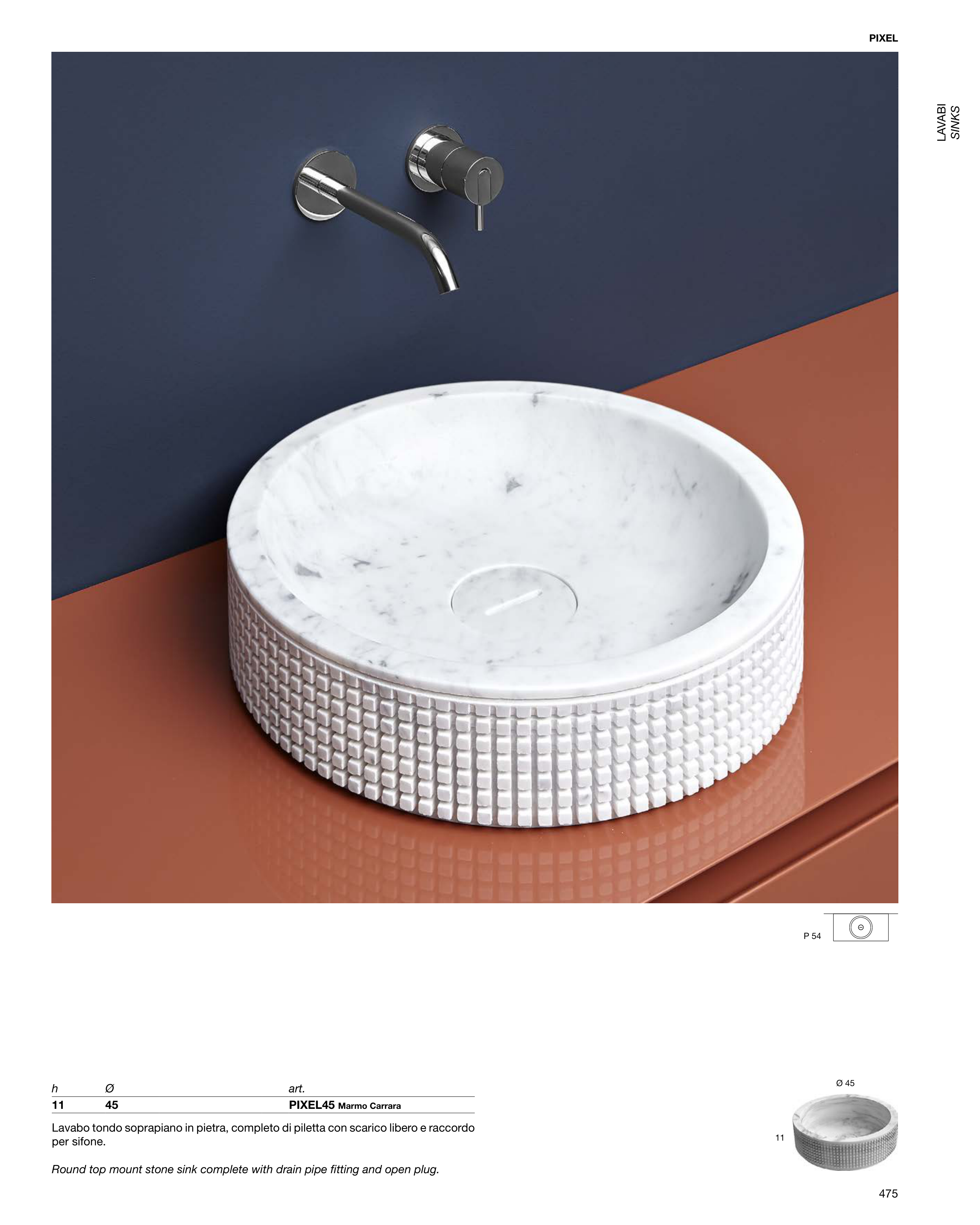 475 Lavabo tondo soprapiano in pietra, completo di piletta con scarico libero e raccordo per sifone. Round top mount stone sink complete with drain pipe fitting and open plug. P 54 11 Ø 45 PIXEL h Ø art. 11 45 PIXEL45 Marmo Carrara LAVABI SINKS