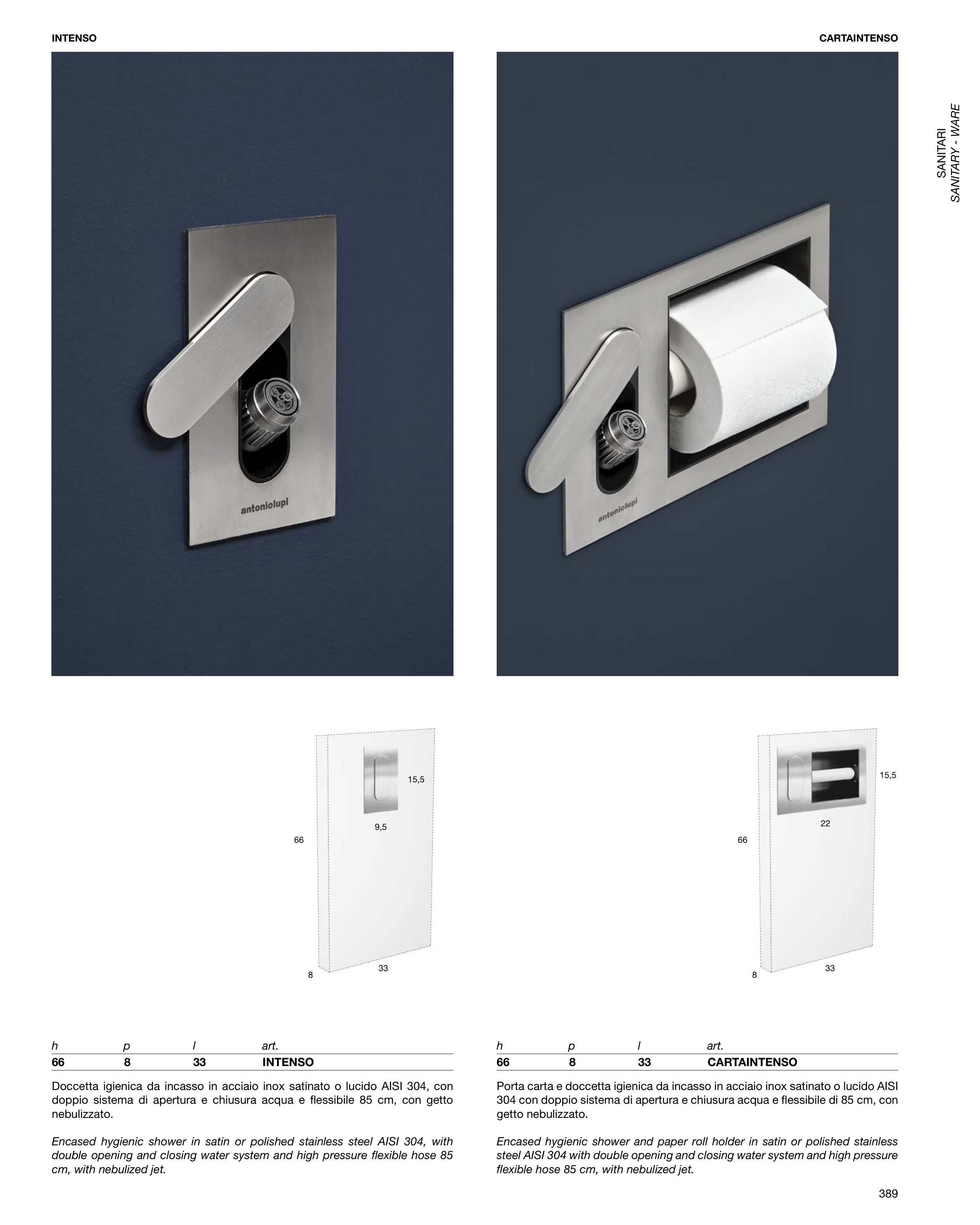 Porta carta e doccetta igienica da incasso in acciaio inox satinato o lucido AISI