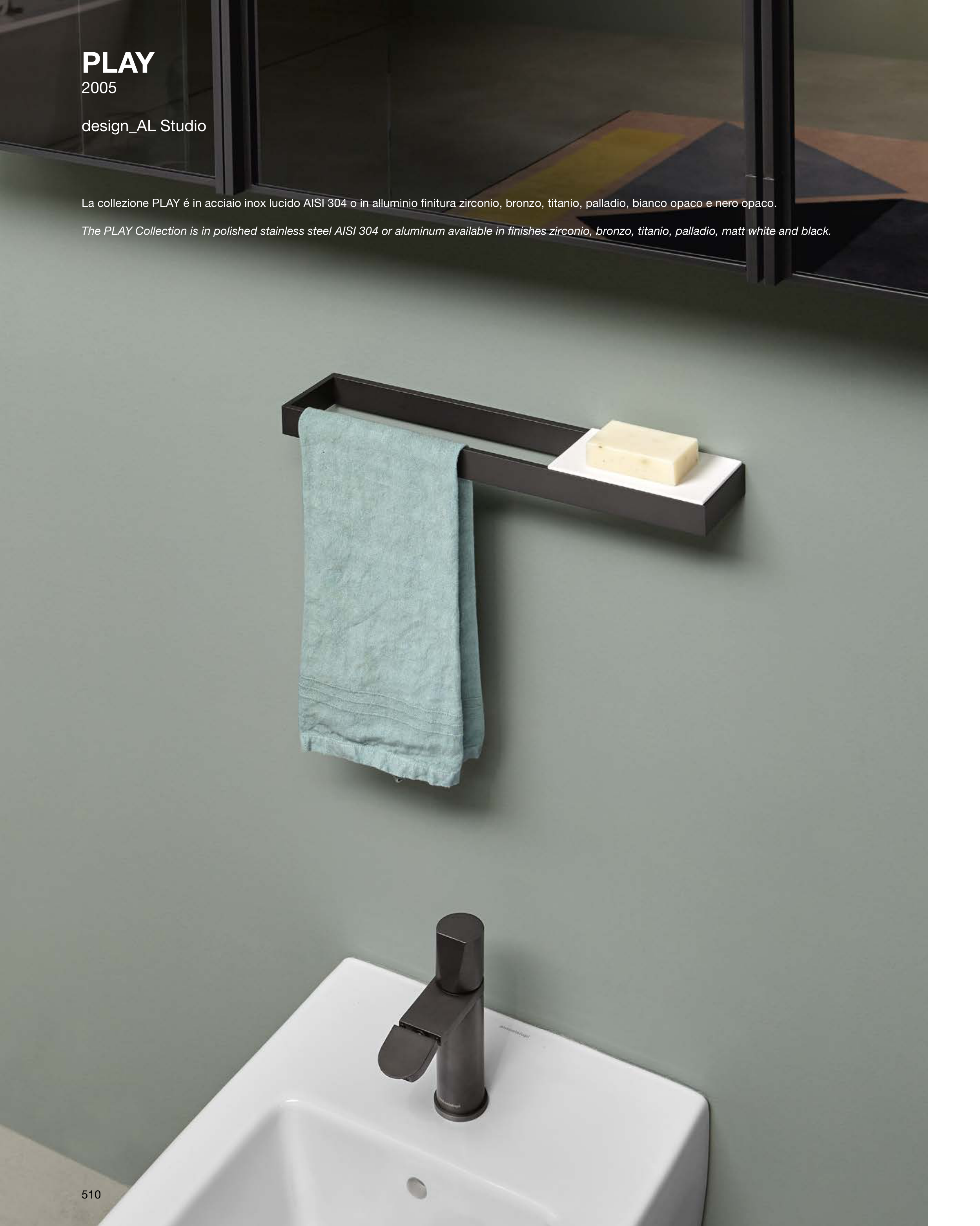 The PLAY Collection is in polished stainless steel AISI 304 or aluminum available in finishes zirconio, bronzo, titanio, palladio, matt white and black.