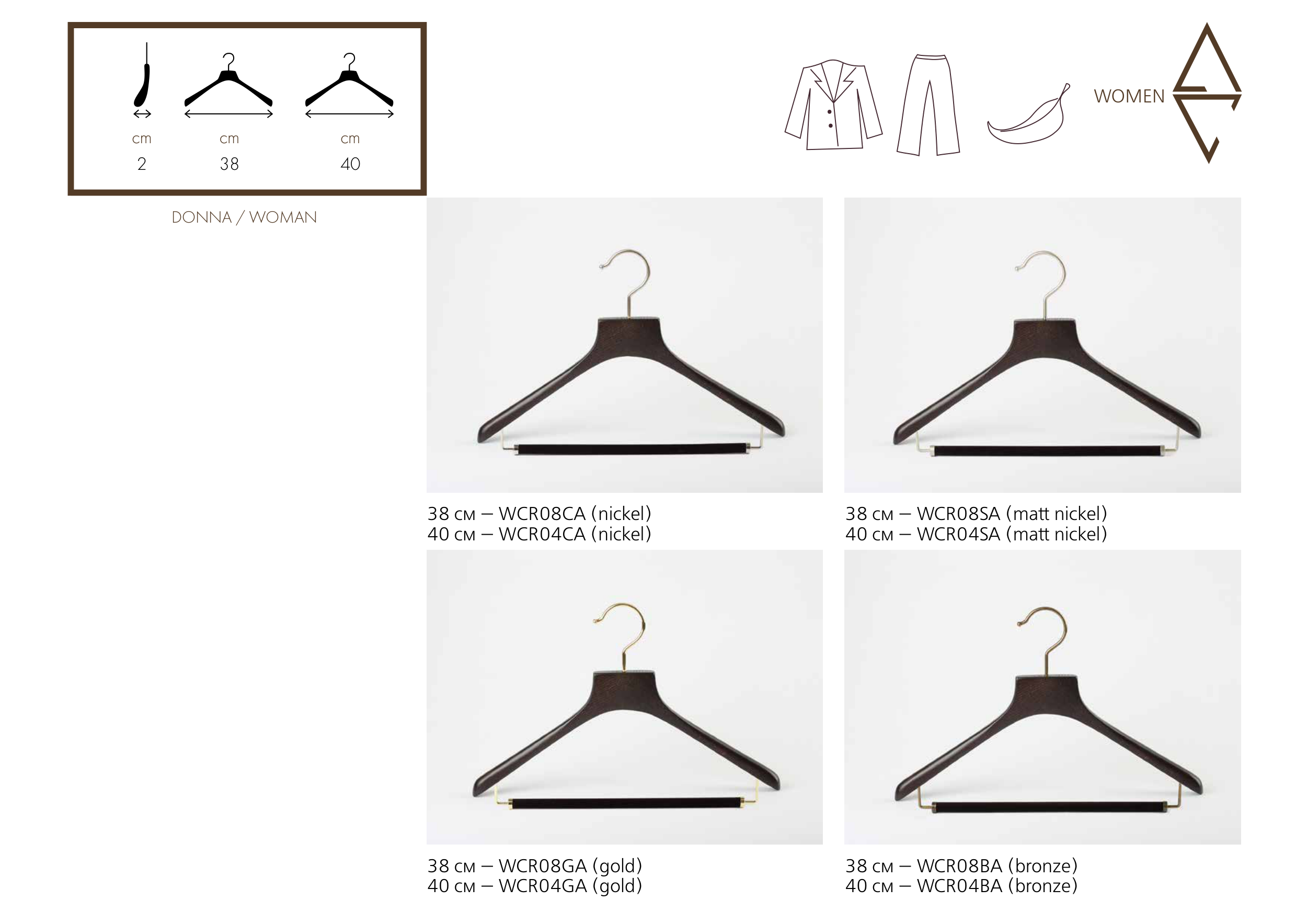 WOMEN 38 см — WСR08CA (nickel) 40 см — WСR04CA (nickel) 38 см — WCR08GA (gold) 40 см — WCR04GA (gold) 38 см — WCR08SA (matt nickel) 40 см — WCR04SA (matt nickel) 38 см — WCR08BA (bronze) 40 см — WCR04BA (bronze) cm 2 DONNA / WOMAN cm 40 cm 38