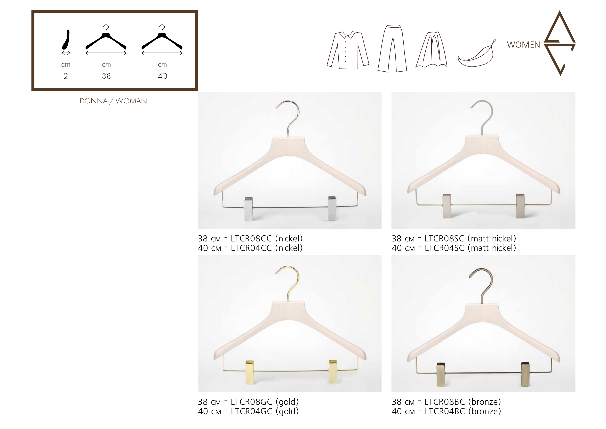 WOMEN 38 см — LTCR08CC (nickel) 40 см — LTCR04CC (nickel) 38 см — LTCR08GC (gold) 40 см — LTCR04GC (gold) 38 см — LTCR08SC (matt nickel) 40 см — LTCR04SC (matt nickel) 38 см — LTCR08BC (bronze) 40 см — LTCR04BC (bronze) cm 2 DONNA / WOMAN cm 40 cm 38