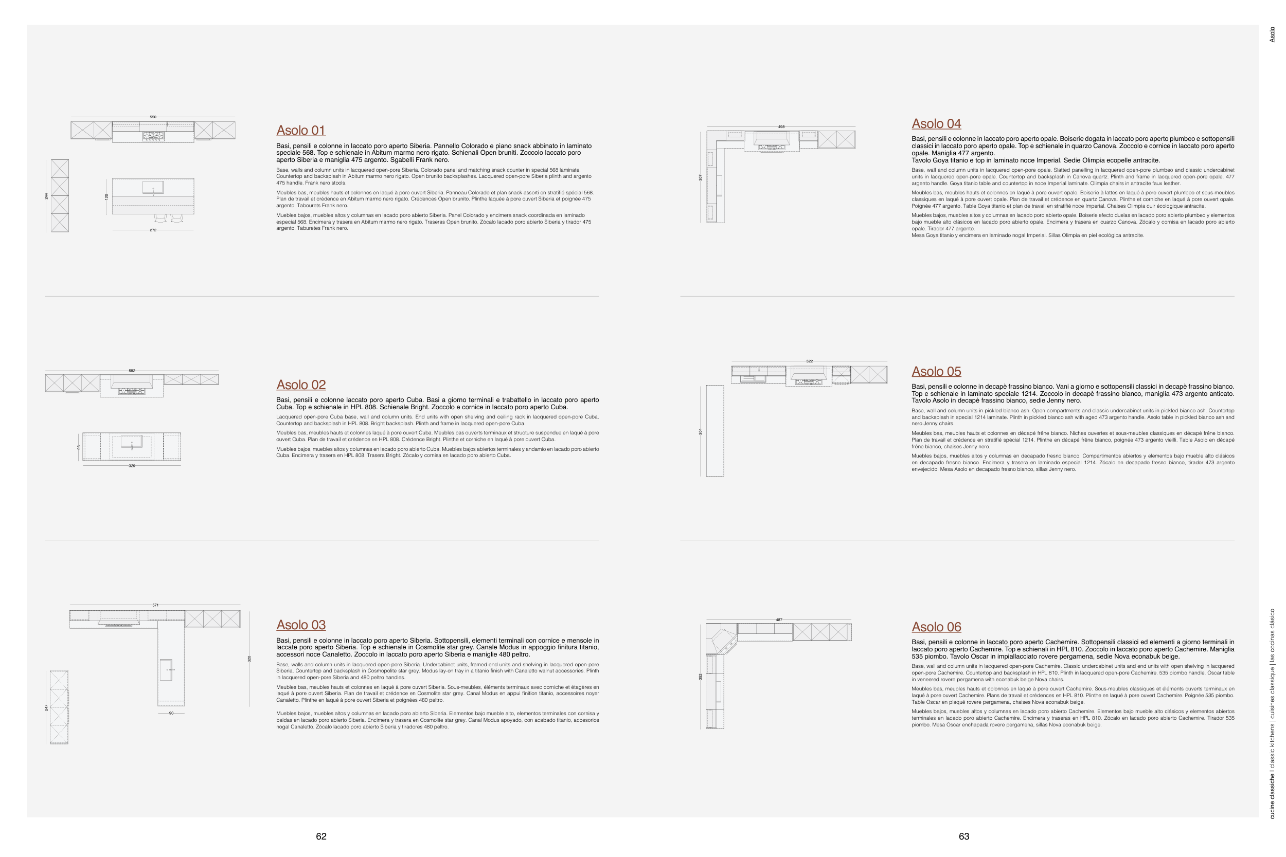 and backsplash in special 1214 laminate. Plinth in pickled bianco ash with aged 473 argento handle. Asolo table in pickled bianco ash and