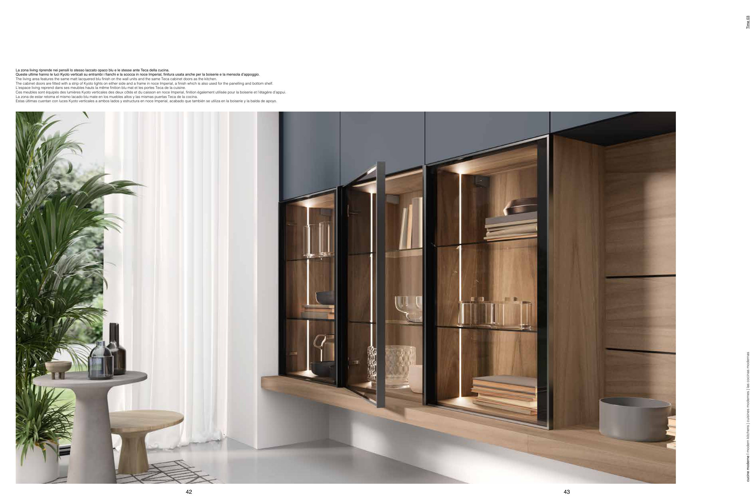 L’espace living reprend dans ses meubles hauts la même finition blu mat et les portes Teca de la cuisine.