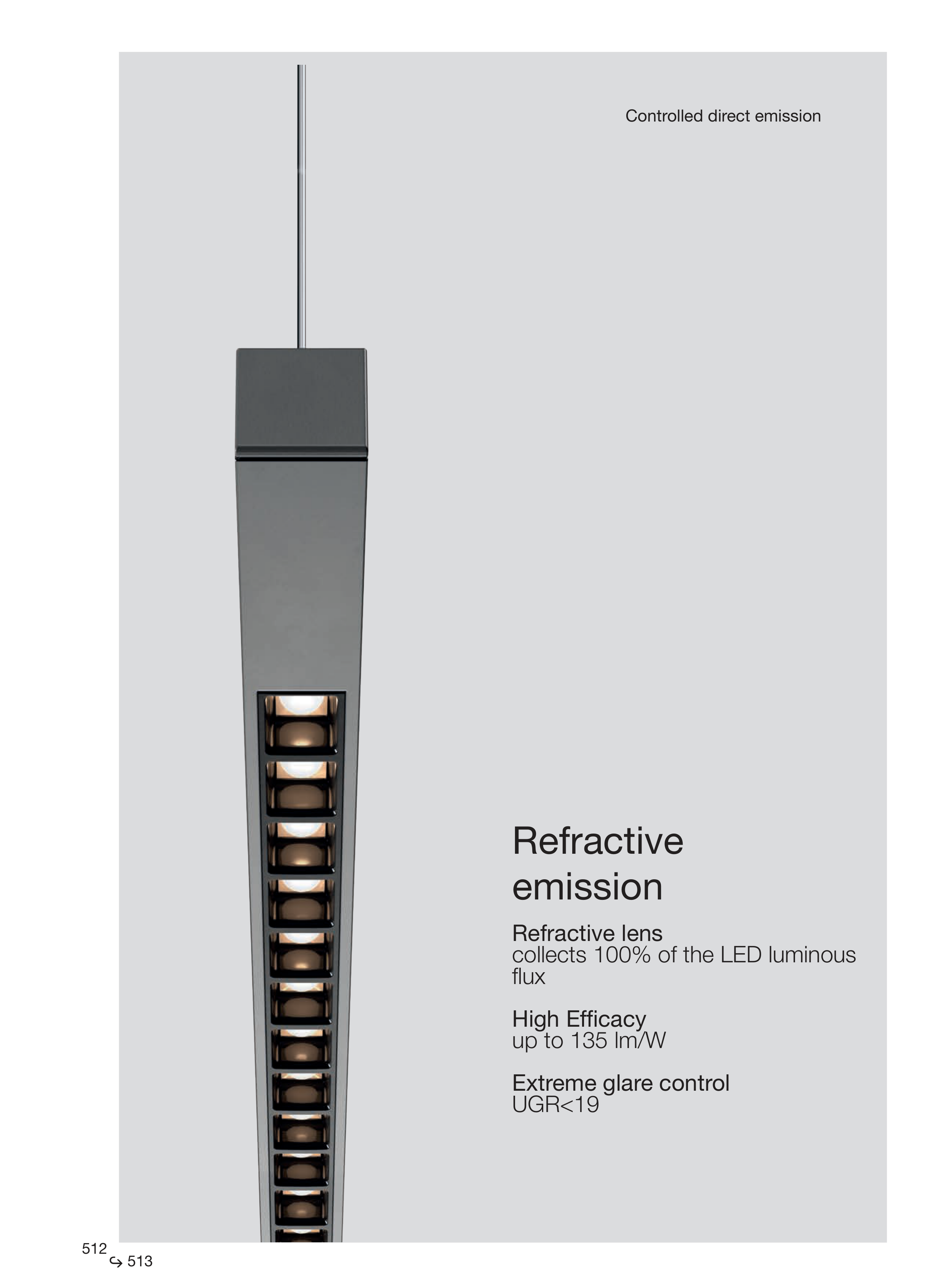 Controlled direct emission Refractive lens collects 100% of the LED luminous flux High Efficacy up to 135 lm/W Extreme glare control UGR<19 Refractive emission 512 513