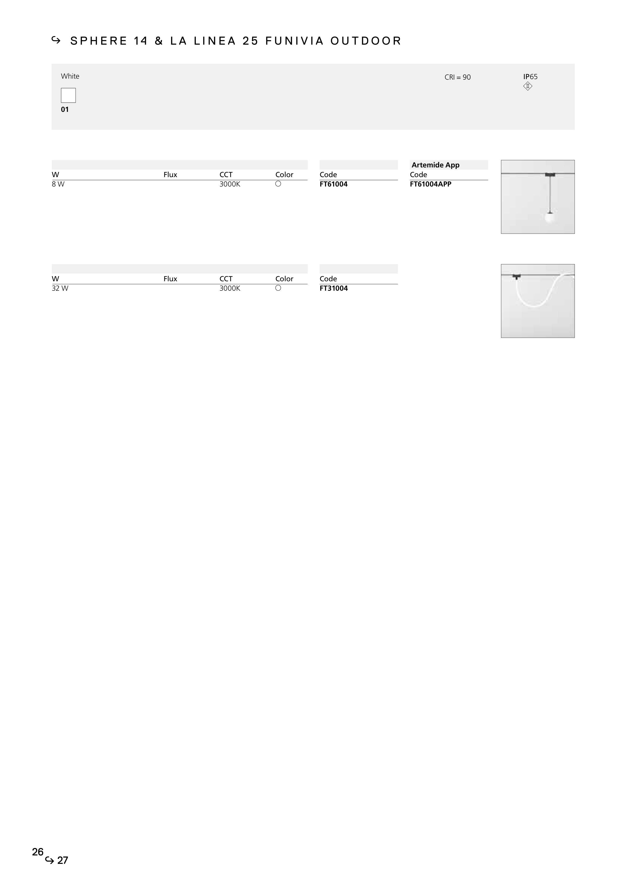 IP65 CRI = 90 White 01 S P H E R E 1 4 & L A L I N E A 2 5 F U N I V I A O U T D O O R W 32 W Color Flux CCT 3000K Code FT61004 W 8 W Artemide App Code FT61004APP Color Flux CCT 3000K Code FT31004 26 27 26 27