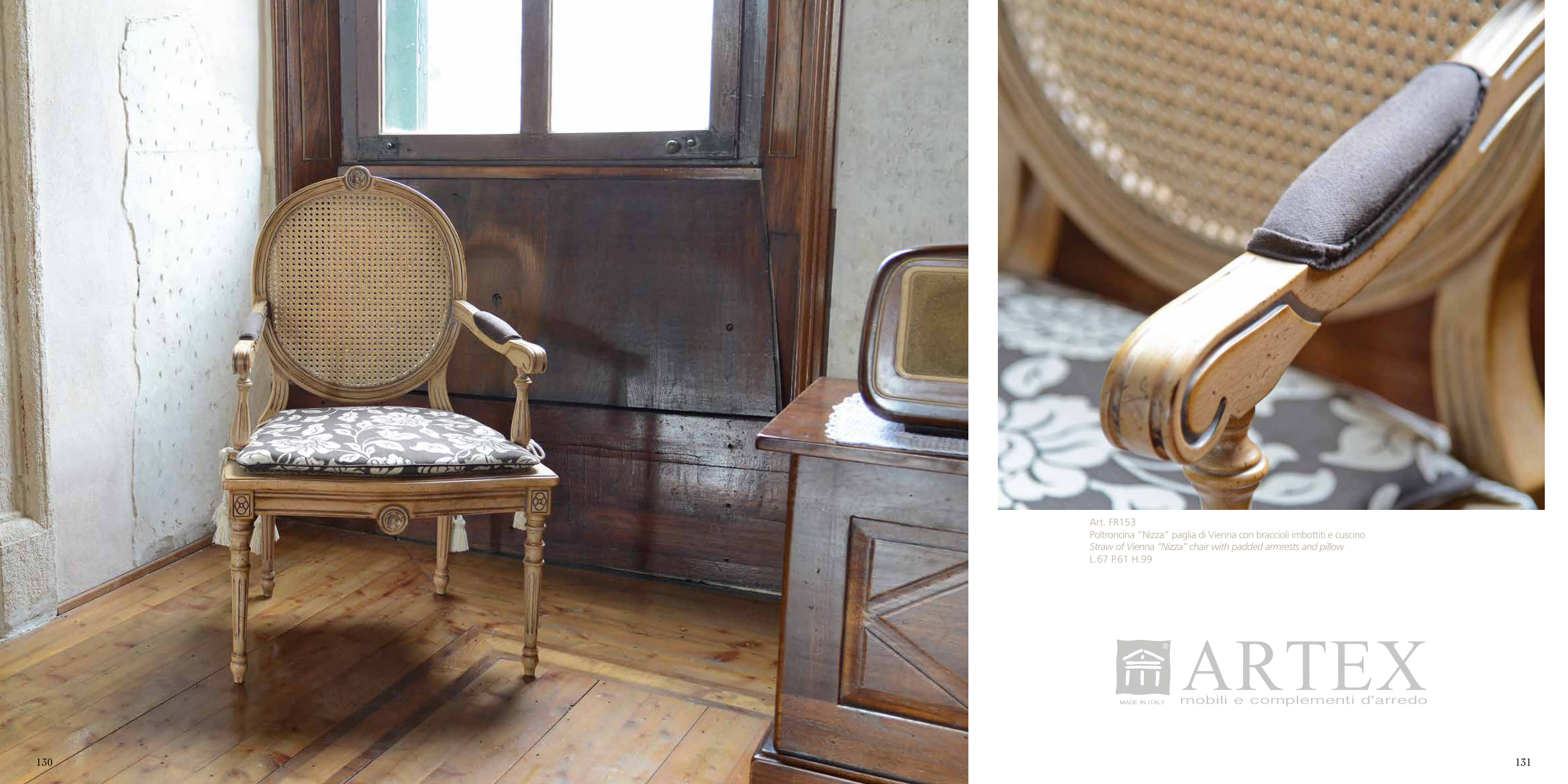 Art. FR153 Poltroncina “Nizza” paglia di Vienna con braccioli imbottiti e cuscino Straw of Vienna “Nizza” chair with padded armrests and pillow L.67 P.61 H.99 130 131
