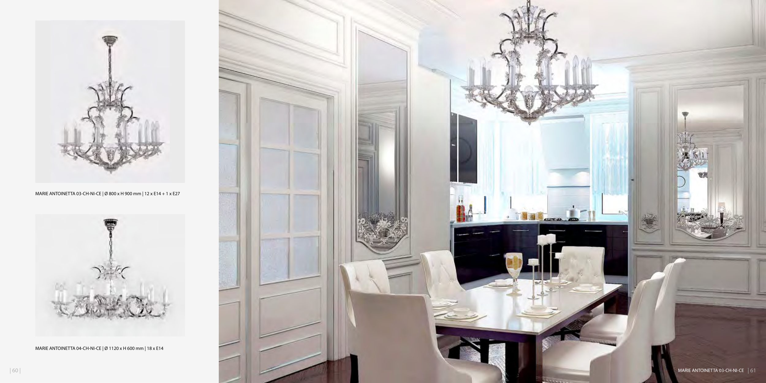 MARIE ANTOINETTA 03-CH-NI-CE | Ø 800 x H 900 mm | 12 x E14 + 1 x E27 MARIE ANTOINETTA 04-CH-NI-CE | Ø 1120 x H 600 mm | 18 x E14 MARIE ANTOINETTA 03-CH-NI-CE | 61 | 60 |