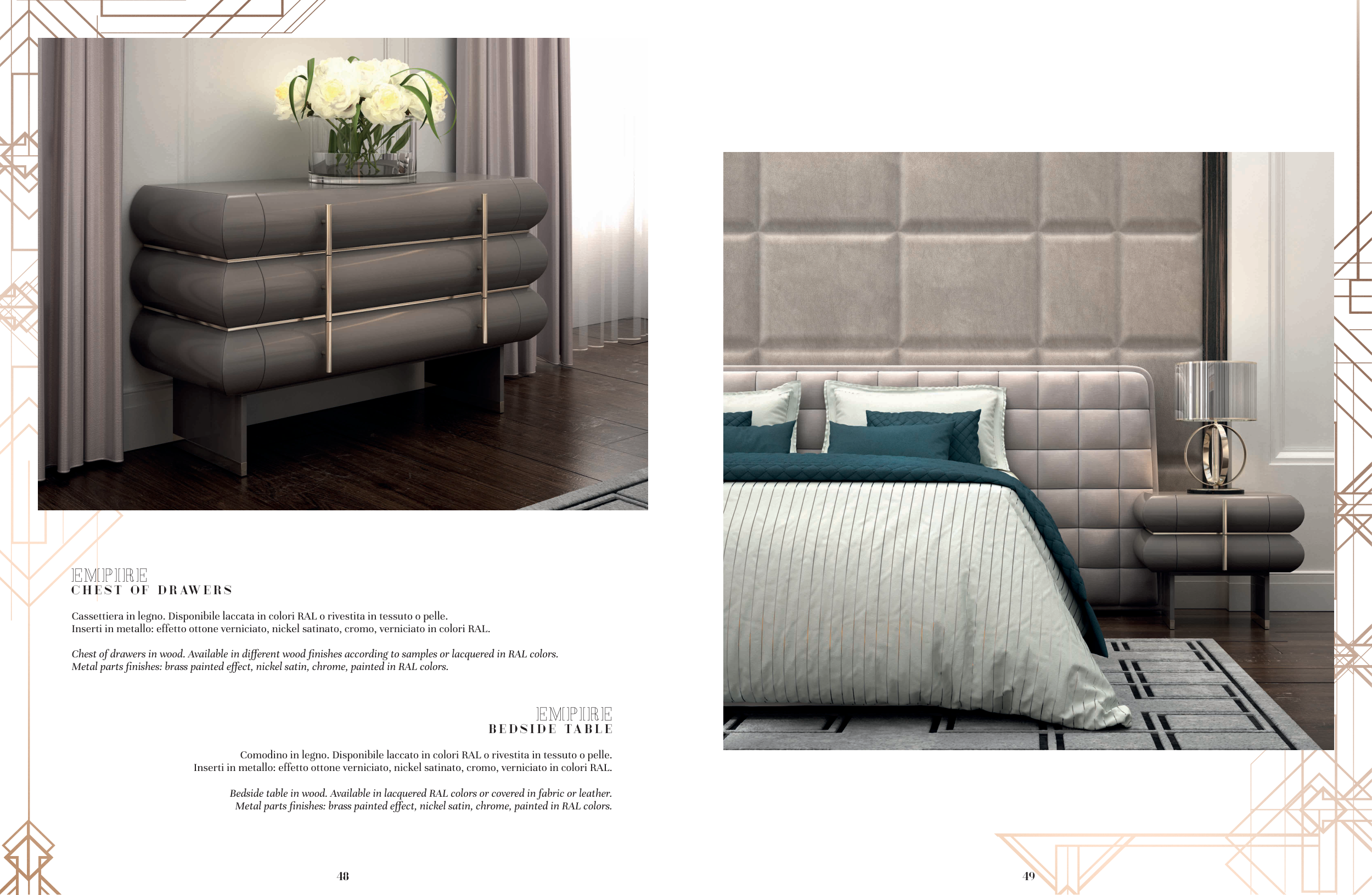 Metal parts finishes: brass painted effect, nickel satin, chrome, painted in RAL colors.