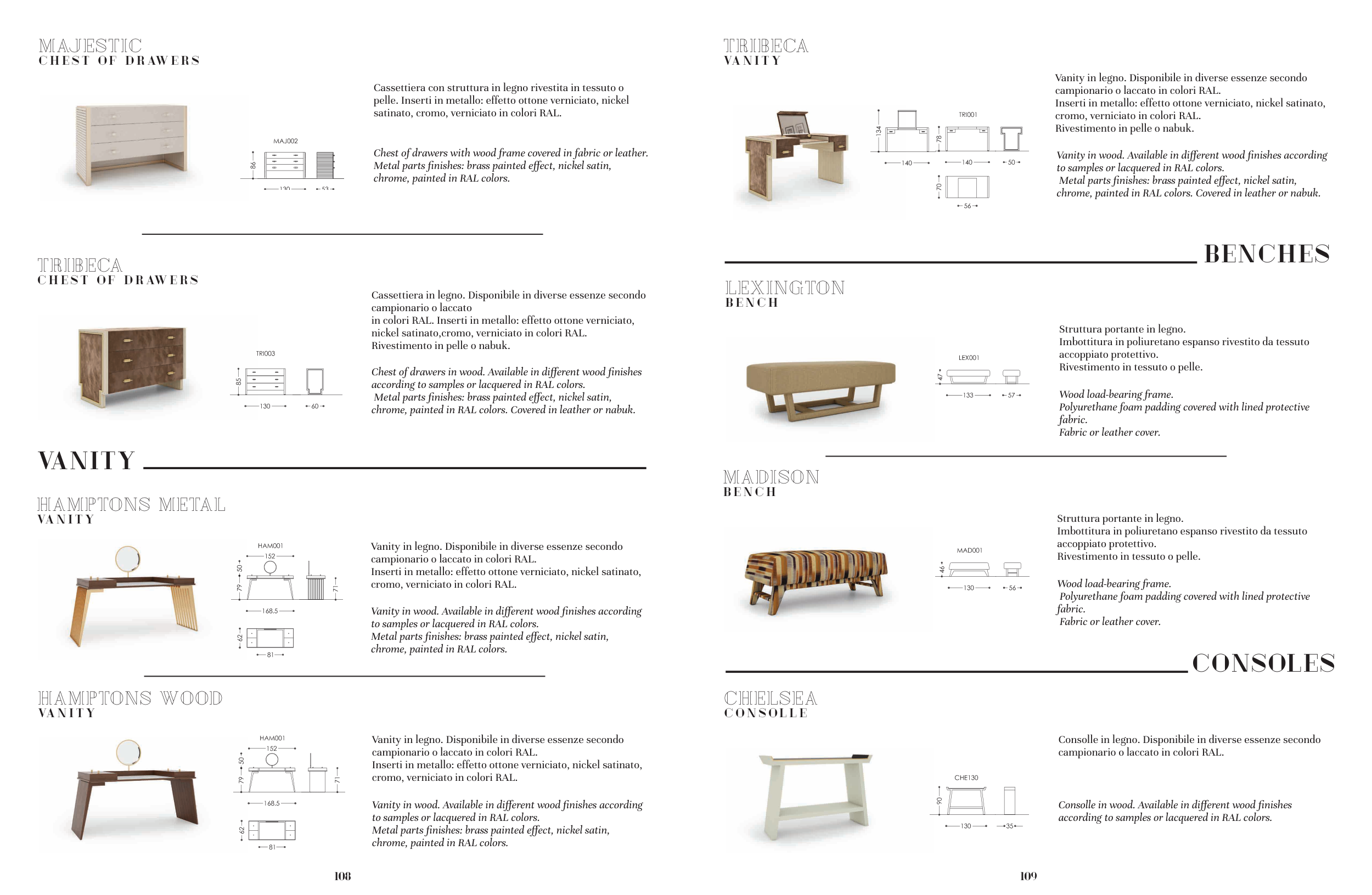 in colori RAL. Inserti in metallo: effetto ottone verniciato,