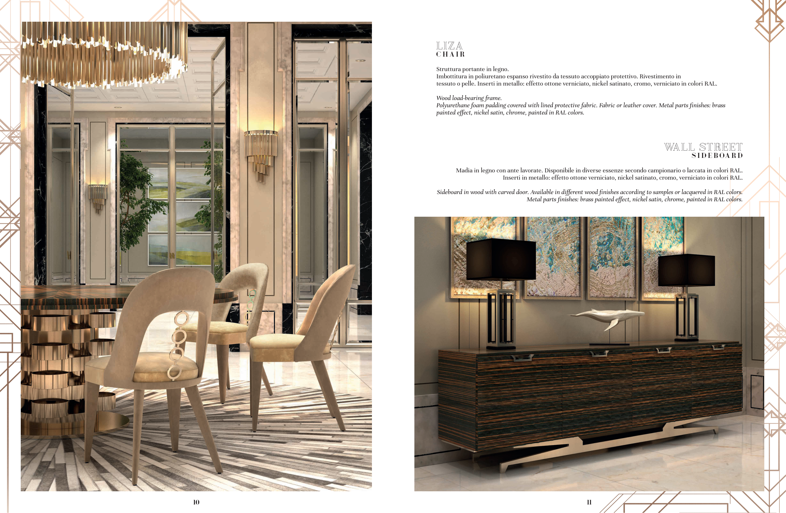 Metal parts finishes: brass painted effect, nickel satin, chrome, painted in RAL colors.