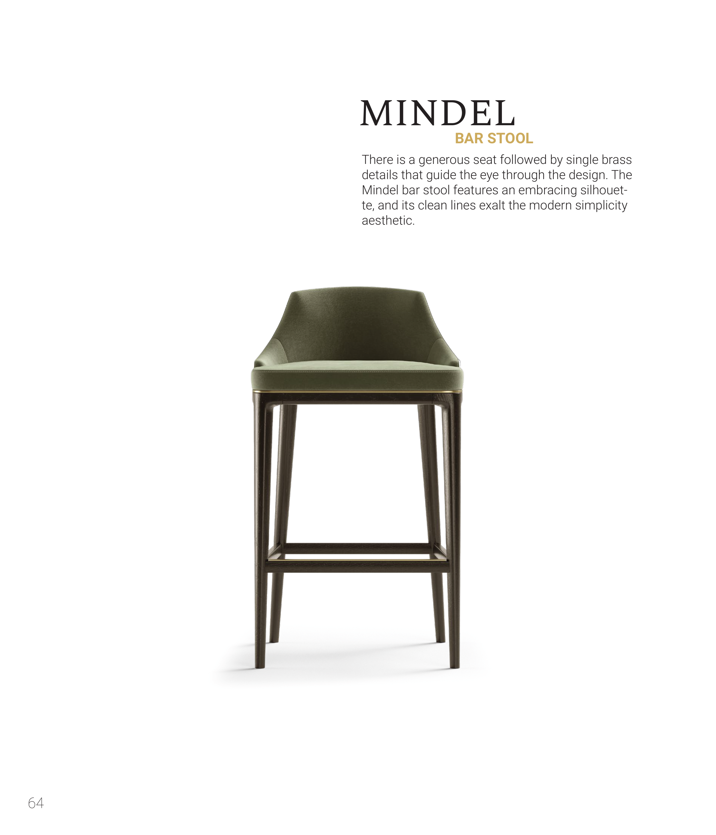 64 MINDEL There is a generous seat followed by single brass details that guide the eye through the design. The Mindel bar stool features an embracing silhouet- te, and its clean lines exalt the modern simplicity aesthetic. BAR STOOL