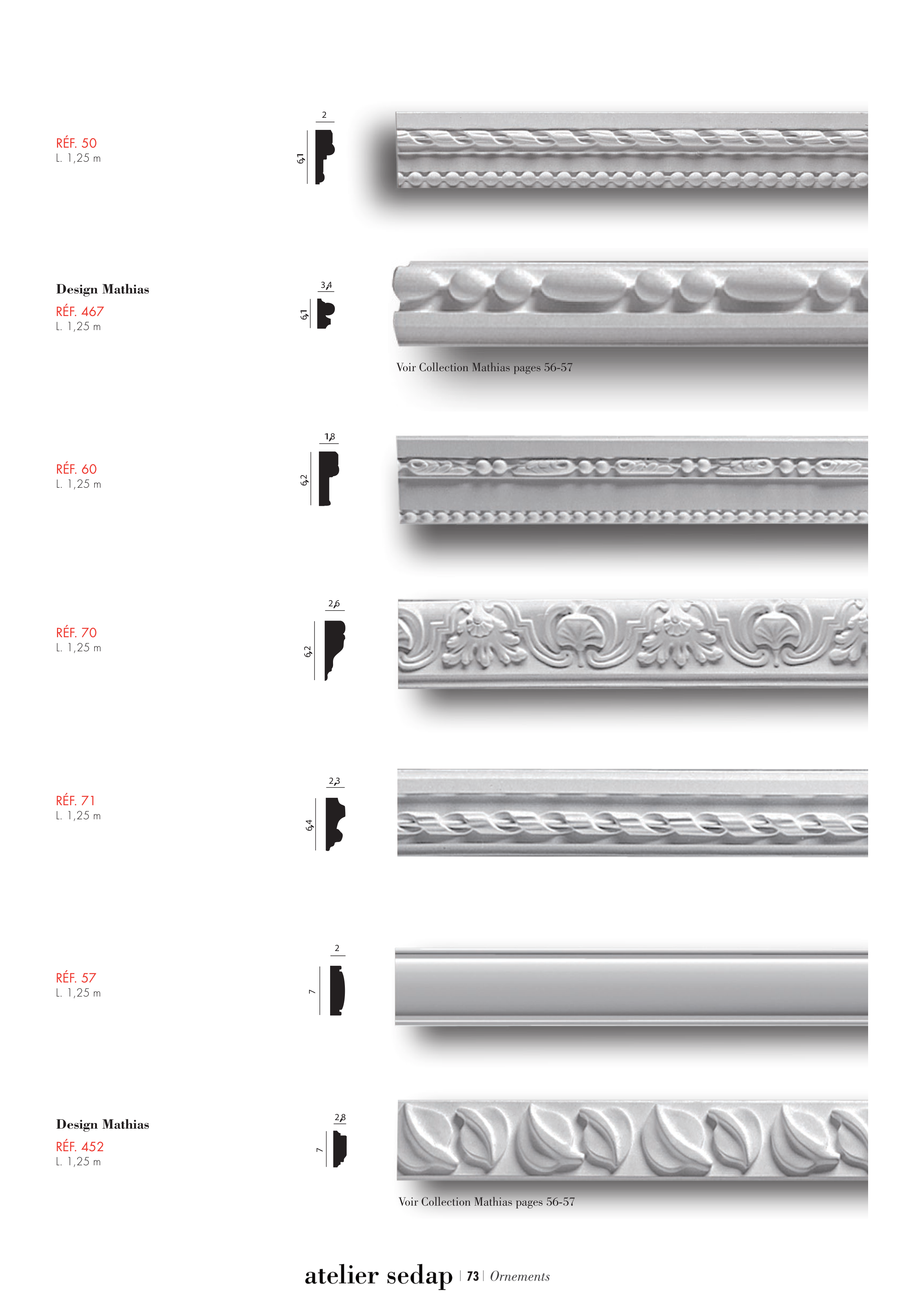 RÉF. 71 L. 1,25 m RÉF. 50 L. 1,25 m RÉF. 60 L. 1,25 m RÉF. 70 L. 1,25 m RÉF. 57 L. 1,25 m Ornements 73 RÉF. 467 L. 1,25 m Design Mathias Voir Collection Mathias pages 56-57 RÉF. 452 L. 1,25 m Design Mathias Voir Collection Mathias pages 56-57