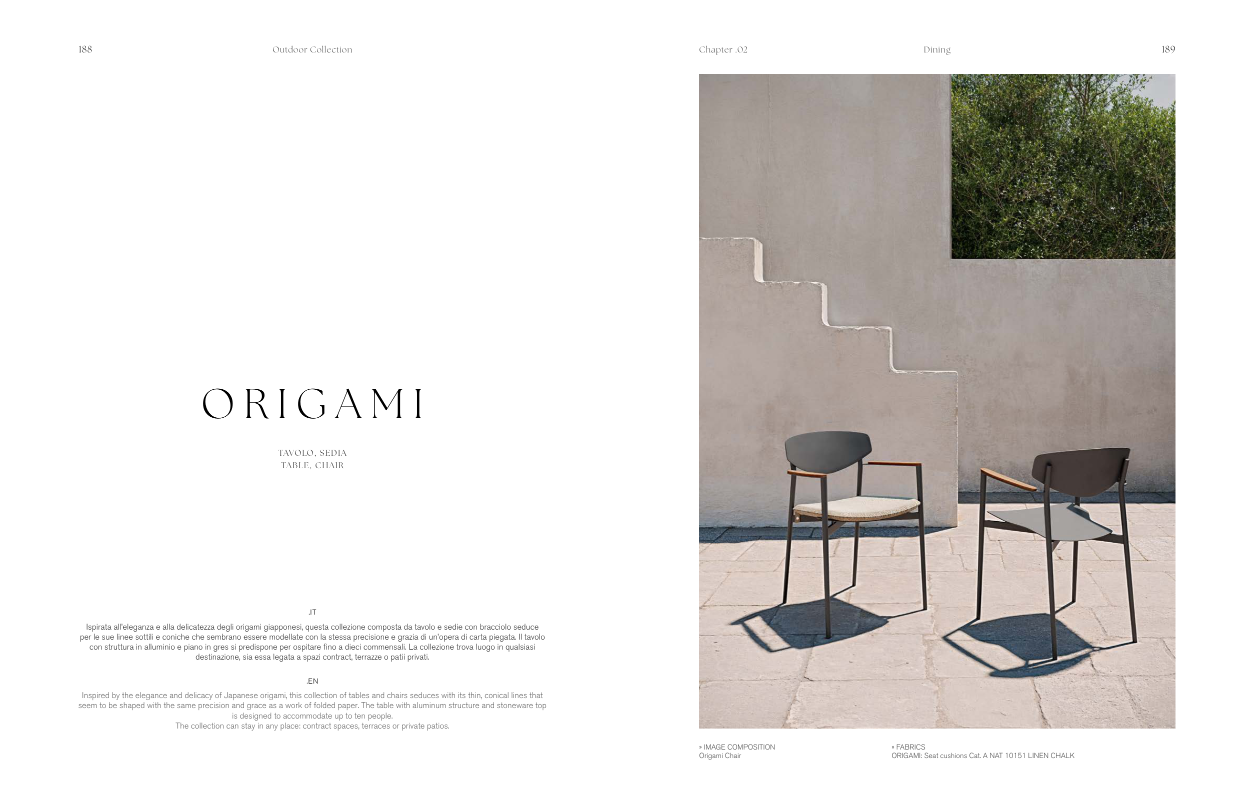Ispirata all’eleganza e alla delicatezza degli origami giapponesi, questa collezione composta da tavolo e sedie con bracciolo seduce