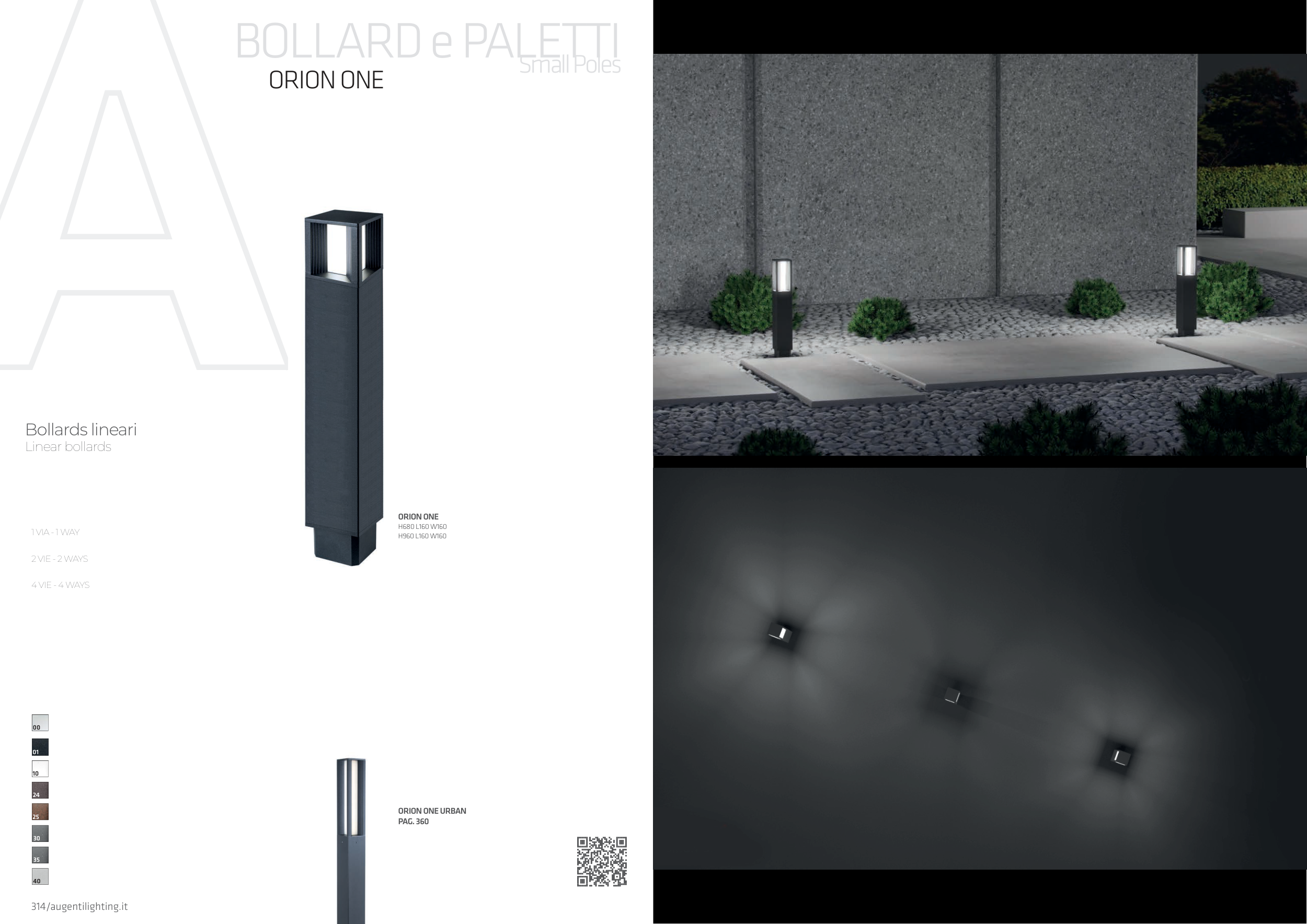 314/augentilighting.it BOLLARD e PALETTI Small Poles 315/augentilighting.it 00 01 10 24 25 30 35 40 1 VIA - 1 WAY 2 VIE - 2 WAYS 4 VIE - 4 WAYS ORION ONE ORION ONE H680 L160 W160 H960 L160 W160 ORION ONE URBAN PAG. 360 Bollards lineari Linear bollards