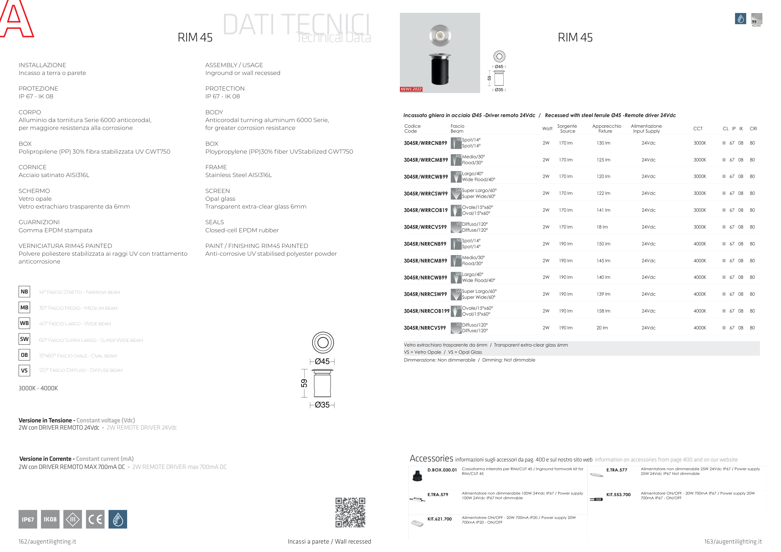 Incassato ghiera in acciaio Ø45 -Driver remoto 24Vdc / Recessed with steel ferrule Ø45 -Remote driver 24Vdc