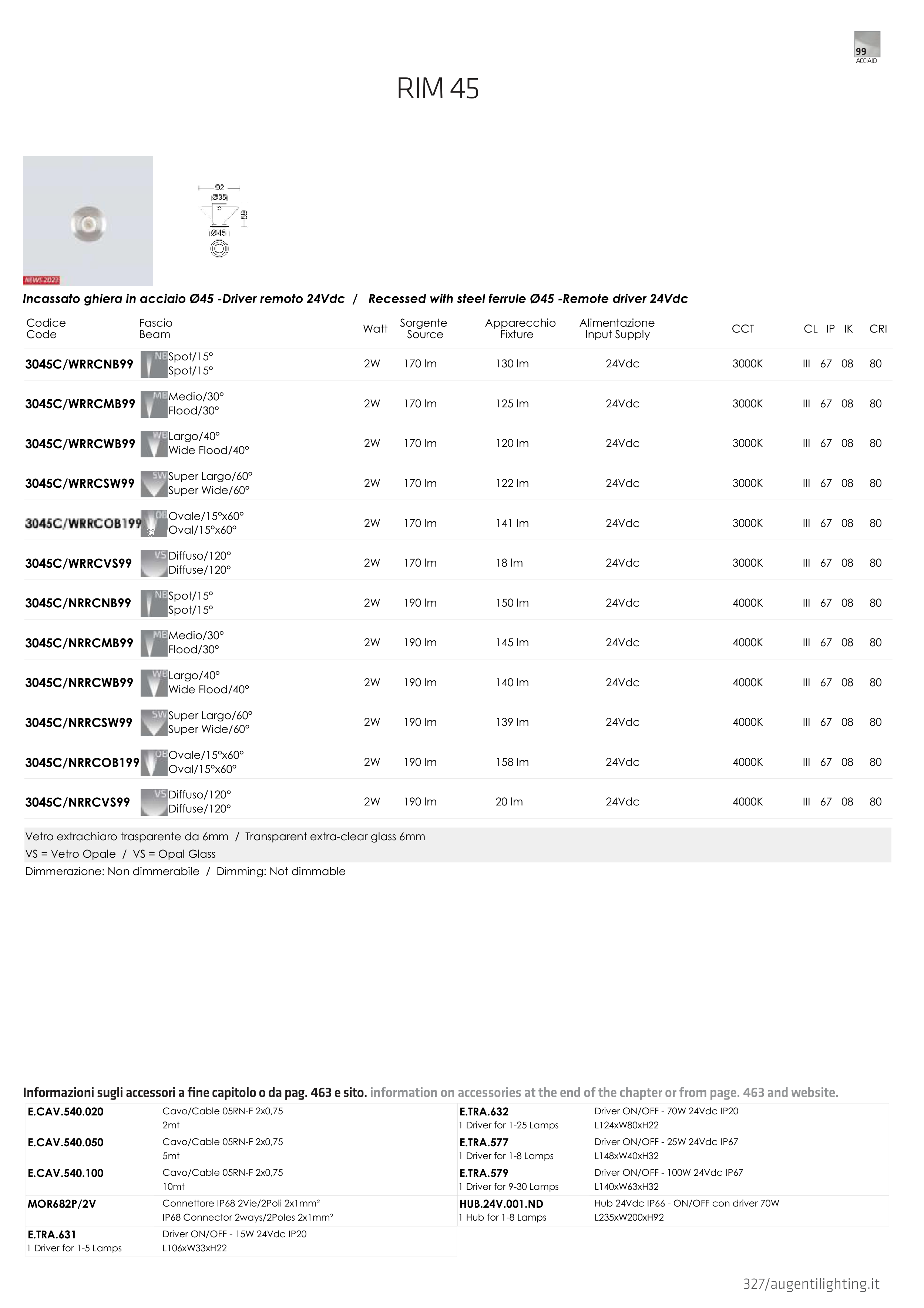 Incassato ghiera in acciaio Ø45 -Driver remoto 24Vdc / Recessed with steel ferrule Ø45 -Remote driver 24Vdc