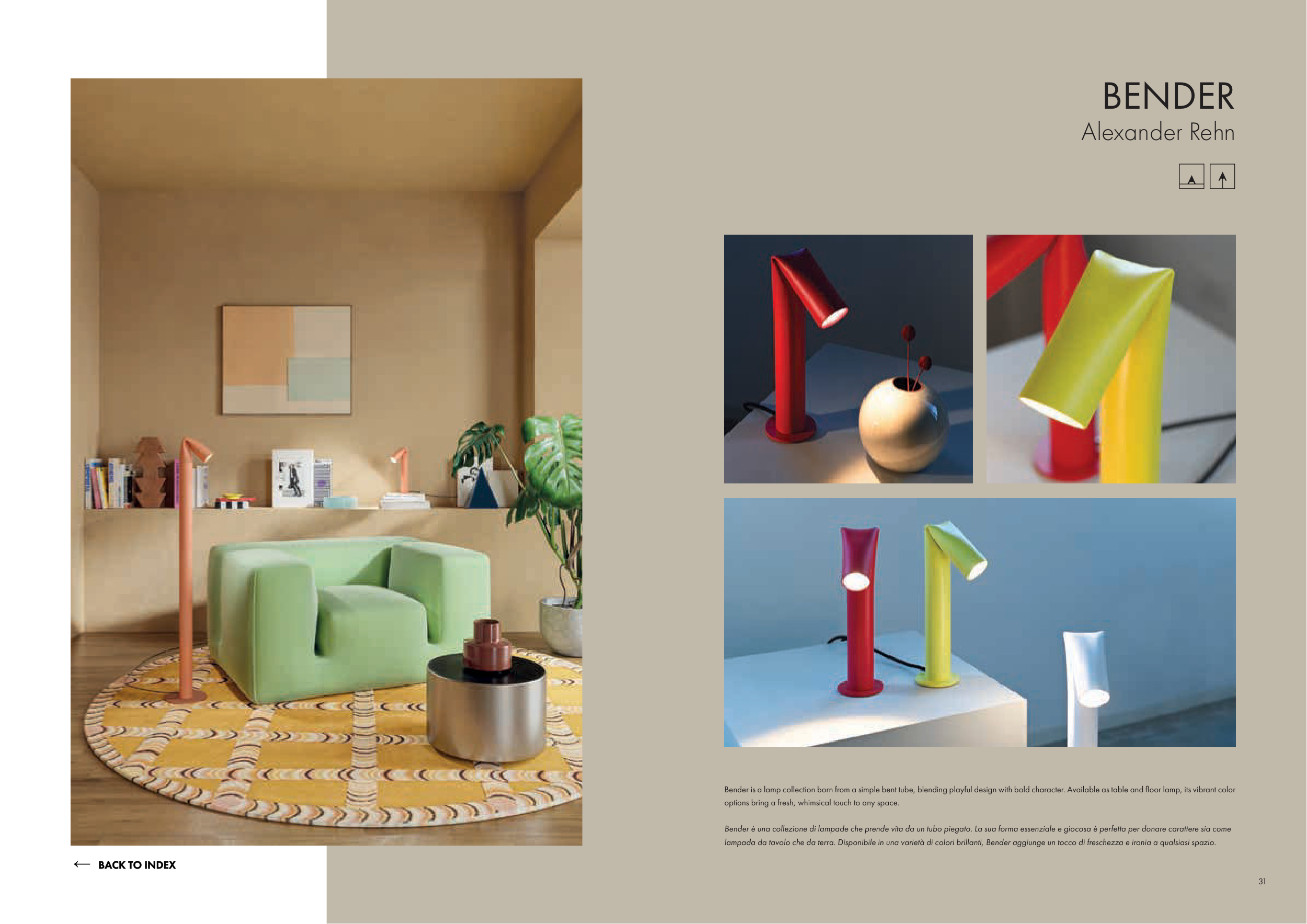 lampada da tavolo che da terra. Disponibile in una varietà di colori brillanti, Bender aggiunge un tocco di freschezza e ironia a qualsiasi spazio.