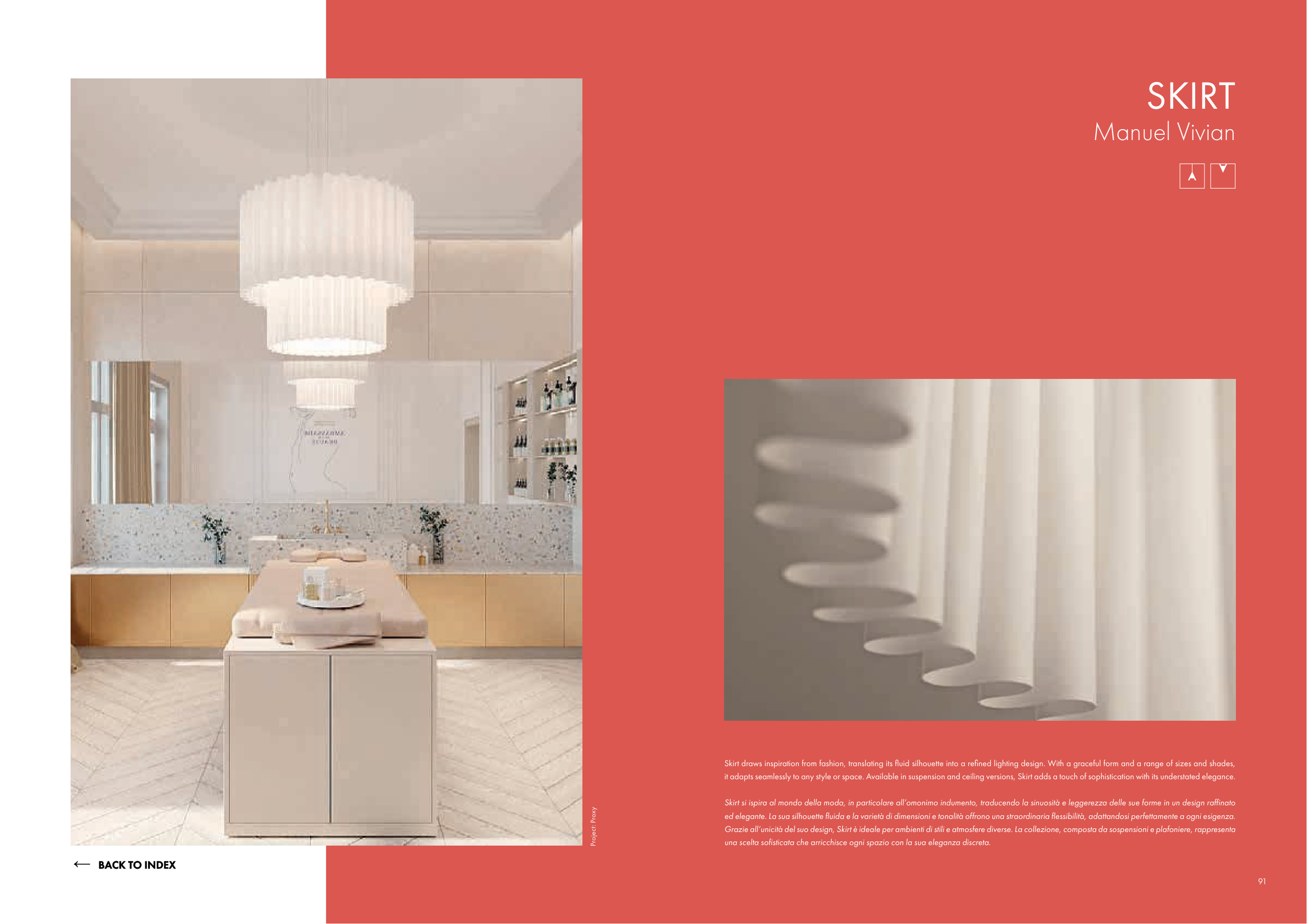 Grazie all’unicità del suo design, Skirt è ideale per ambienti di stili e atmosfere diverse. La collezione, composta da sospensioni e plafoniere, rappresenta
