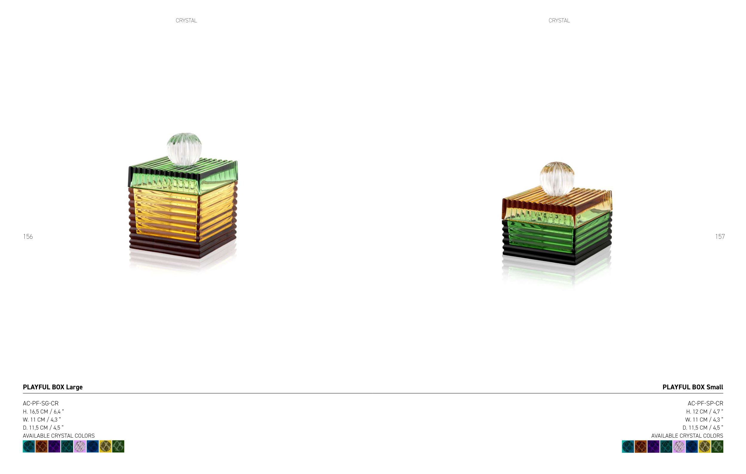 157 156 PLAYFUL BOX Large ACPFSGCR H. 16,5 CM / 6,4 ” W. 11 CM / 4,3 “ D. 11,5 CM / 4,5 “ AVAILABLE CRYSTAL COLORS CRYSTAL PLAYFUL BOX Small ACPFSPCR H. 12 CM / 4,7 ” W. 11 CM / 4,3 “ D. 11,5 CM / 4,5 “ AVAILABLE CRYSTAL COLORS CRYSTAL