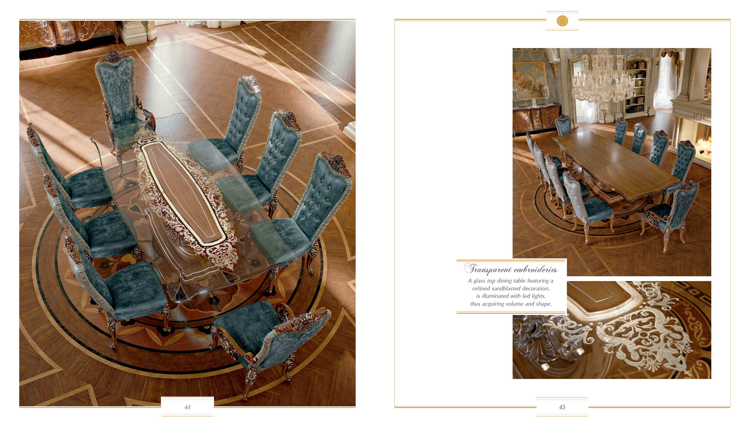 45 44 45 Transparent embroideries A glass top dining table featuring a refined sandblasted decoration, is illuminated with led lights, thus acquiring volume and shape.