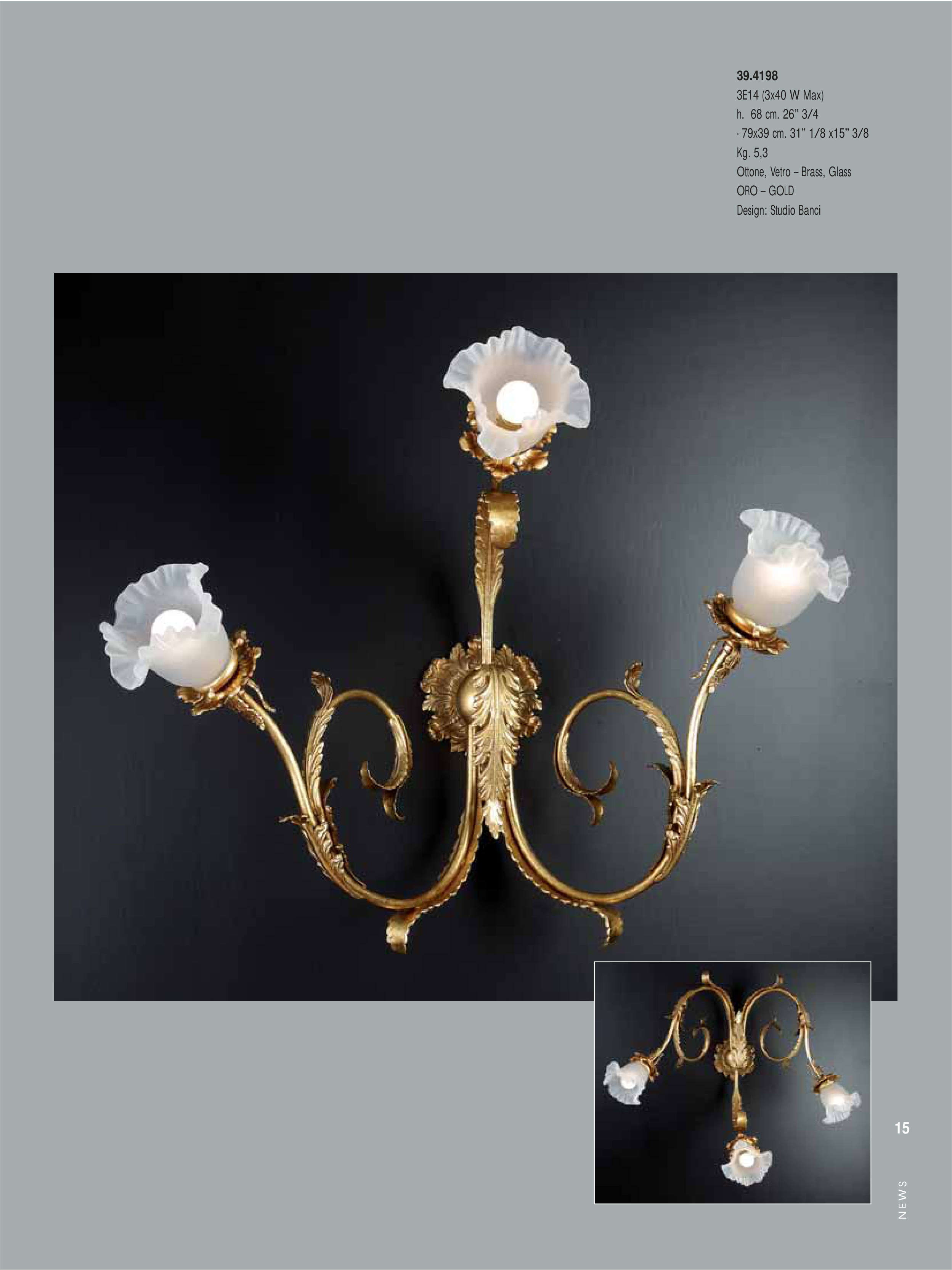 N E W S 15 39.4198 3E14 (3x40 W Max) h. 68 cm. 26” 3/4 - 79x39 cm. 31” 1/8 x15” 3/8 Kg. 5,3 Ottone, Vetro – Brass, Glass ORO – GOLD Design: Studio Banci