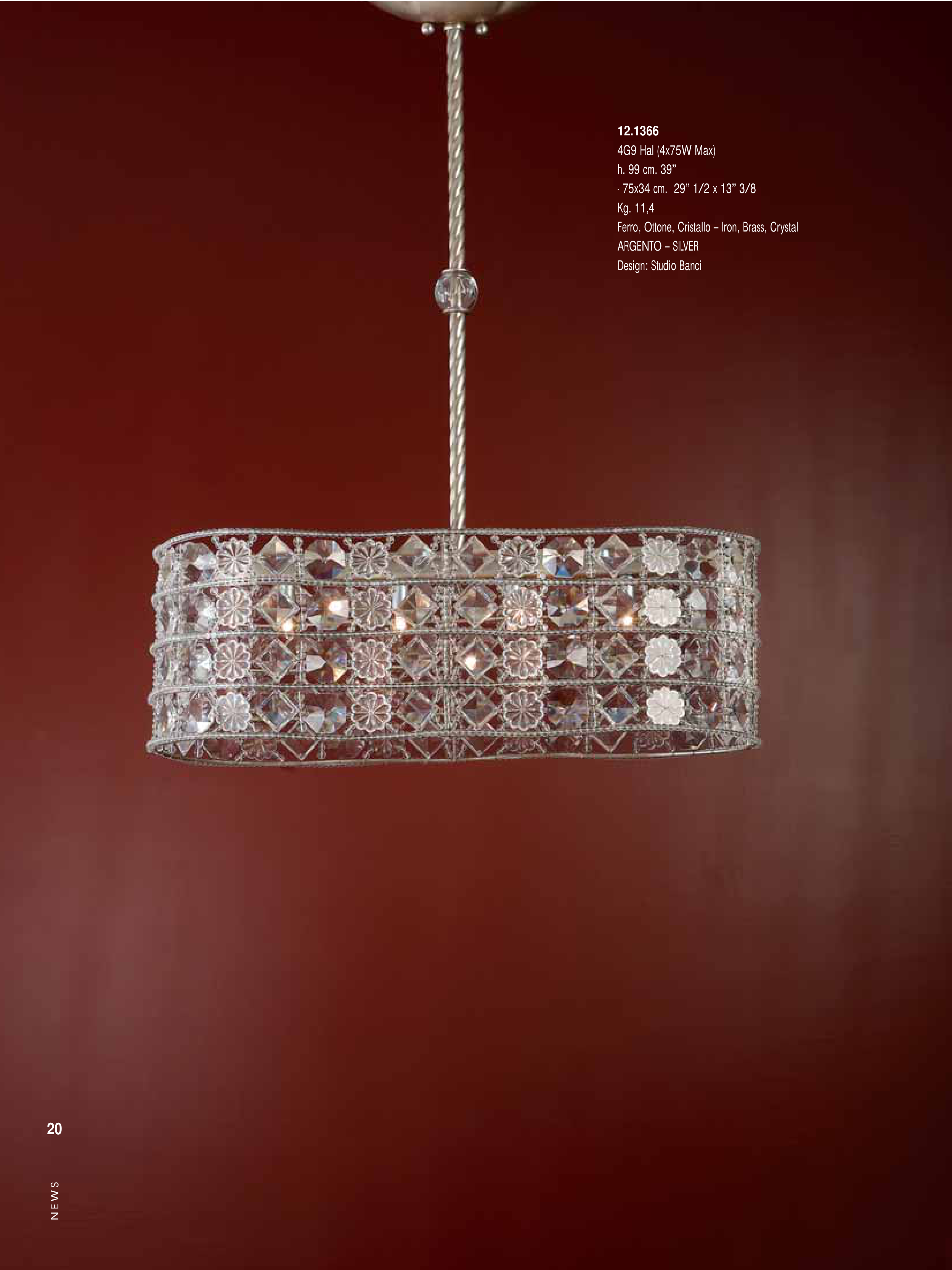 12.1366 4G9 Hal (4x75W Max) h. 99 cm. 39” - 75x34 cm. 29” 1/2 x 13” 3/8 Kg. 11,4 Ferro, Ottone, Cristallo – Iron, Brass, Crystal ARGENTO – SILVER Design: Studio Banci N E W S 20