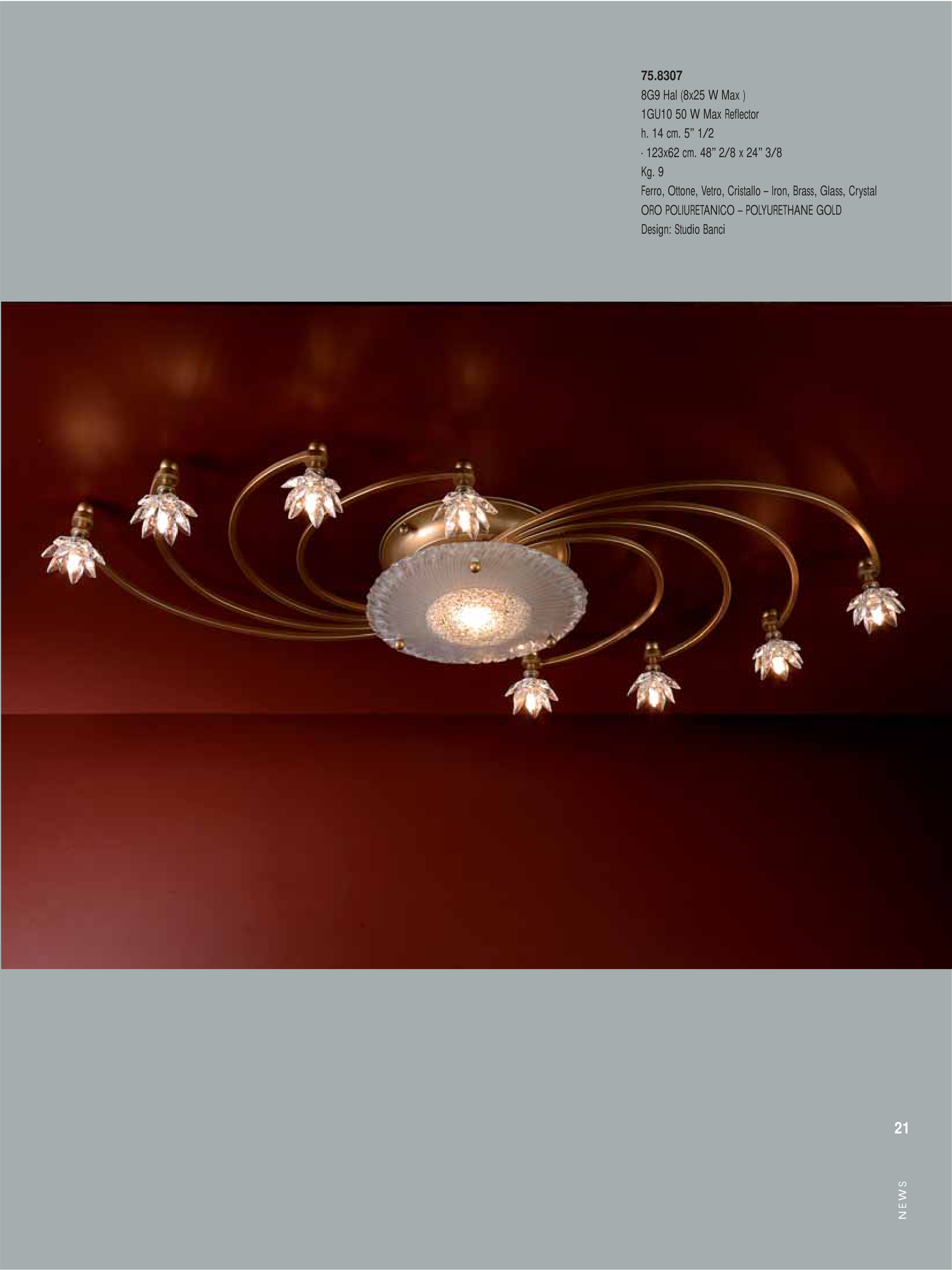 75.8307 8G9 Hal (8x25 W Max ) 1GU10 50 W Max Reflector h. 14 cm. 5” 1/2 - 123x62 cm. 48” 2/8 x 24” 3/8 Kg. 9 Ferro, Ottone, Vetro, Cristallo – Iron, Brass, Glass, Crystal ORO POLIURETANICO – POLYURETHANE GOLD Design: Studio Banci N E W S 21