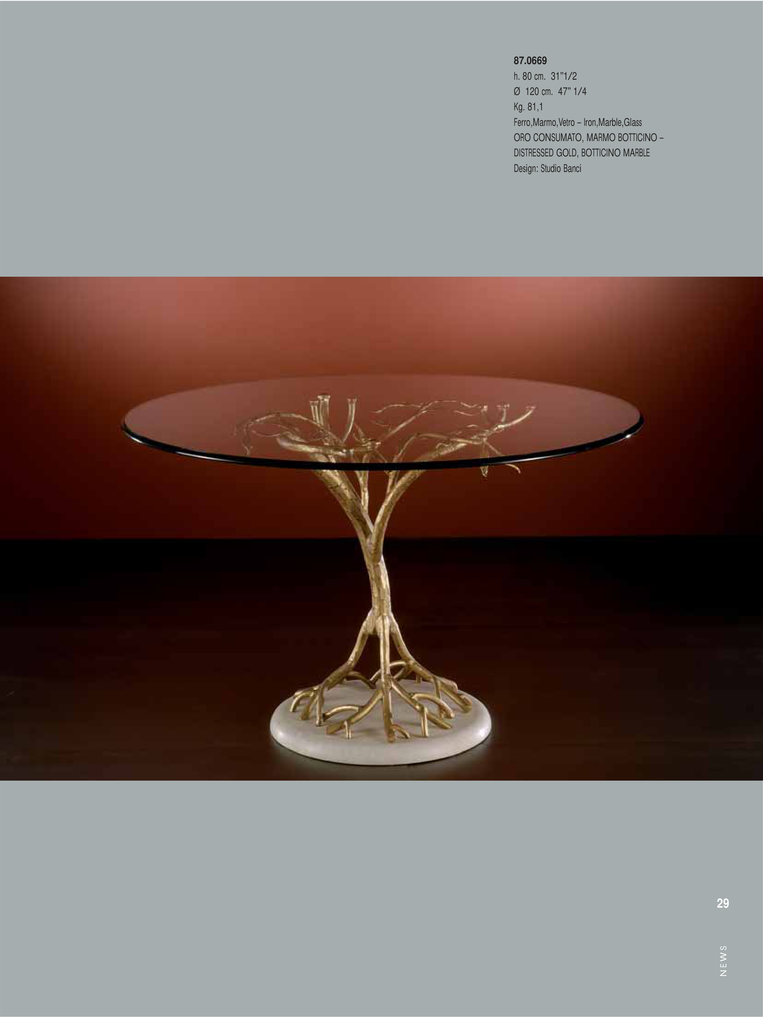 N E W S 29 87.0669 h. 80 cm. 31”1/2 Ø 120 cm. 47” 1/4 Kg. 81,1 Ferro,Marmo,Vetro – Iron,Marble,Glass ORO CONSUMATO, MARMO BOTTICINO – DISTRESSED GOLD, BOTTICINO MARBLE Design: Studio Banci
