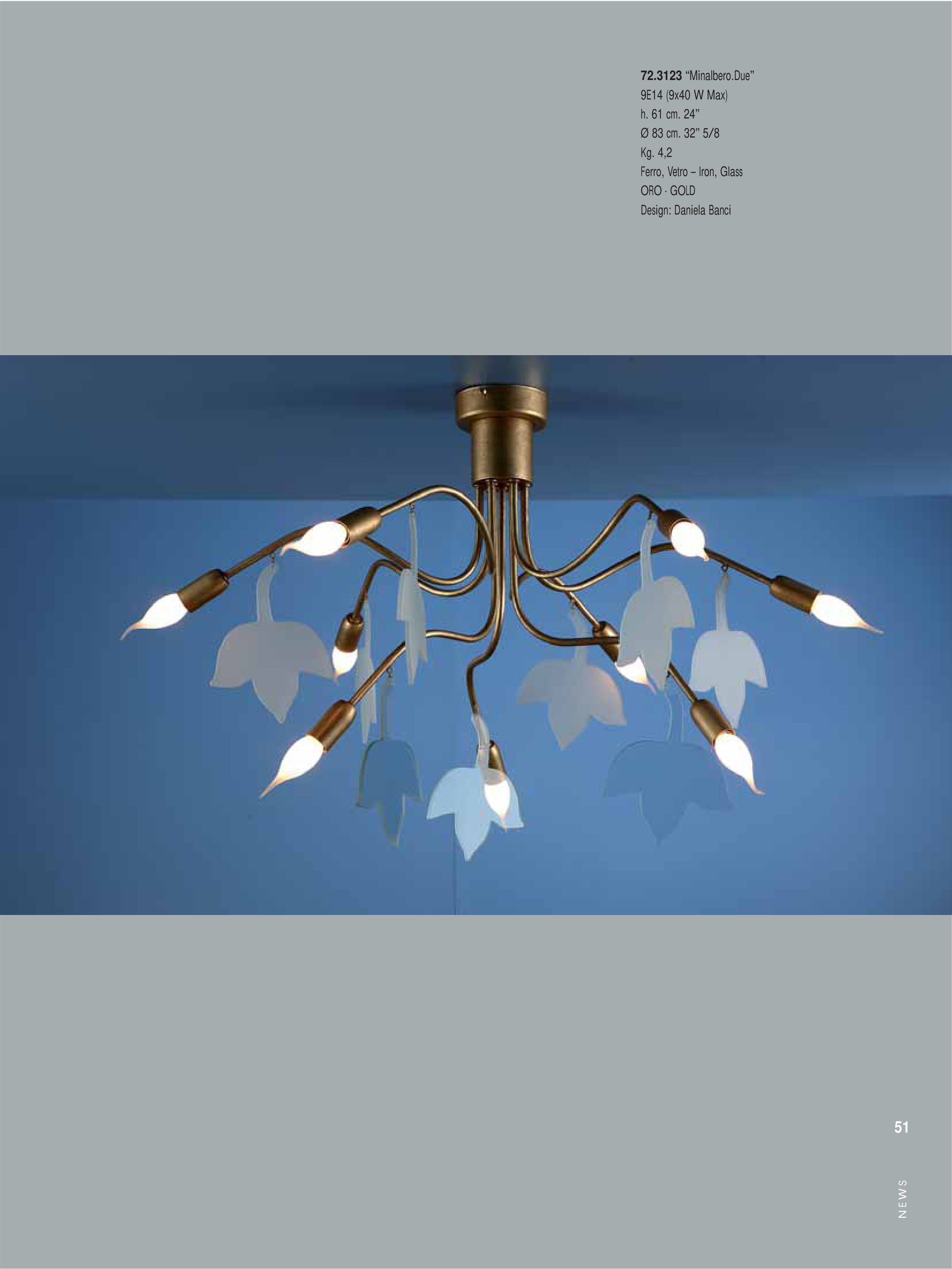 72.3123 “Minalbero.Due” 9E14 (9x40 W Max) h. 61 cm. 24” Ø 83 cm. 32” 5/8 Kg. 4,2 Ferro, Vetro – Iron, Glass ORO - GOLD Design: Daniela Banci N E W S 51