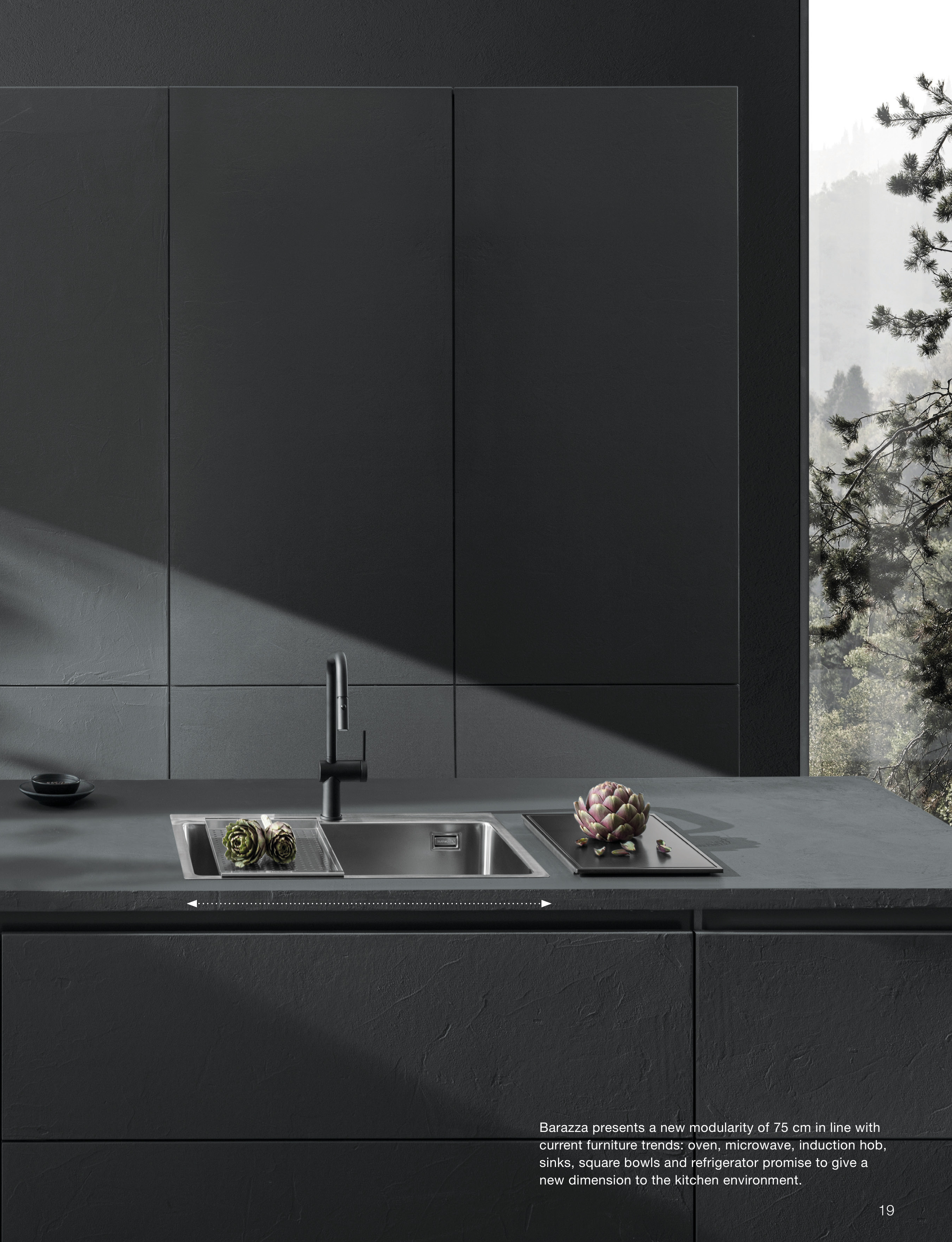 Barazza presents a new modularity of 75 cm in line with current furniture trends: oven, microwave, induction hob, sinks, square bowls and refrigerator promise to give a new dimension to the kitchen environment. 19
