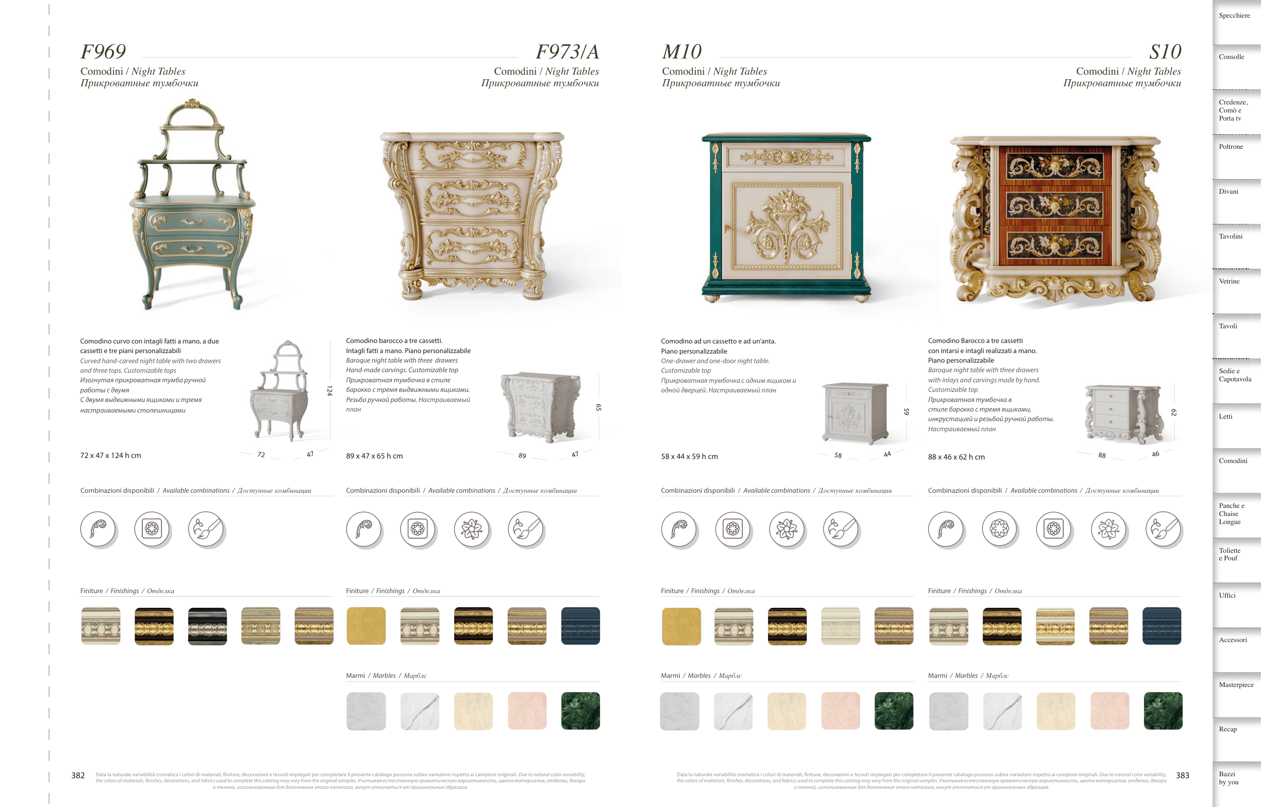 the colors of materials, fnishes, decorations, and fabrics used to complete this catalog may vary from the original samples. Учитывая естественную хроматическую вариативность, цвета материалов, отделки, декора