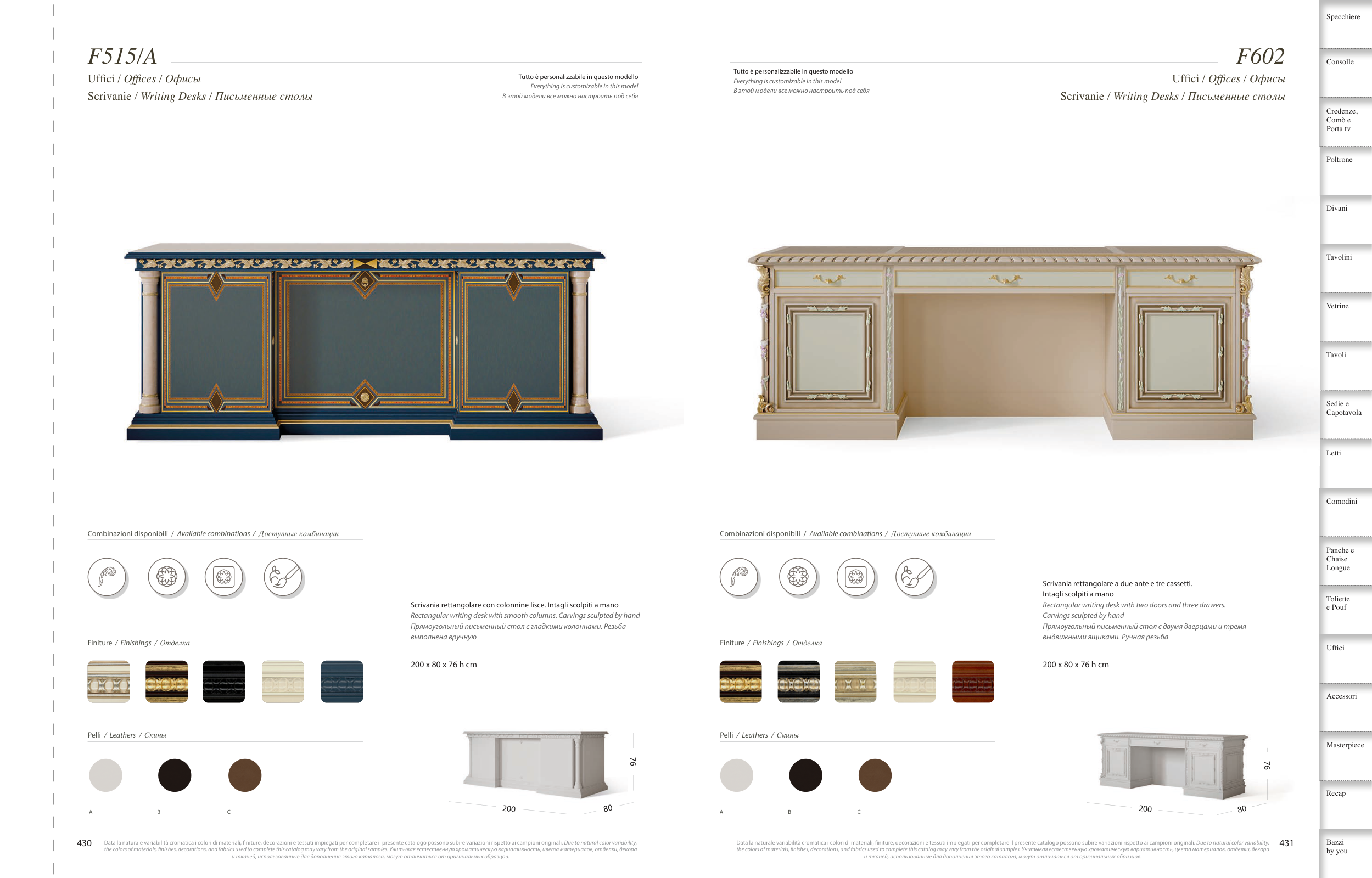 the colors of materials, fnishes, decorations, and fabrics used to complete this catalog may vary from the original samples. Учитывая естественную хроматическую вариативность, цвета материалов, отделки, декора