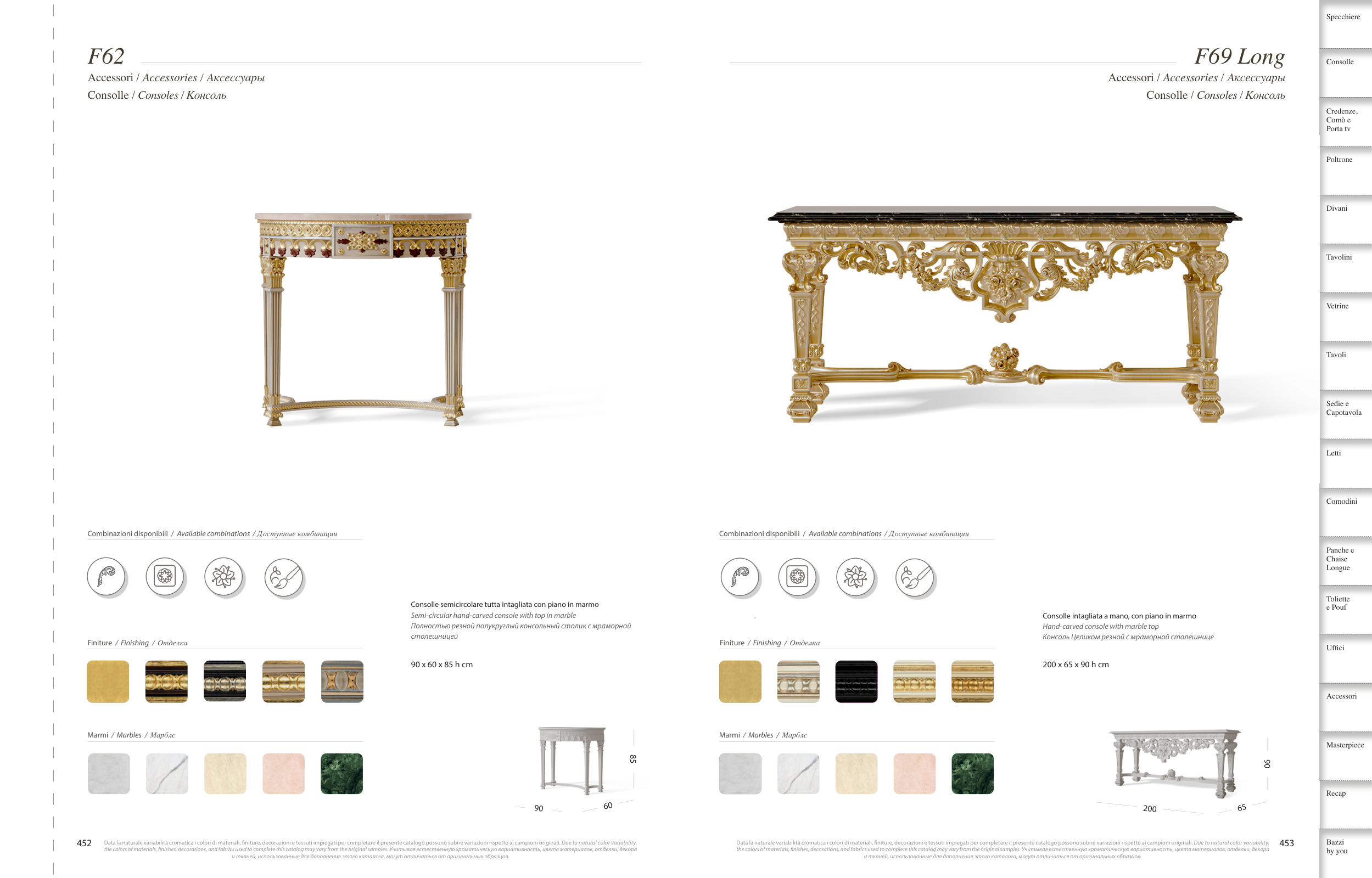 the colors of materials, fnishes, decorations, and fabrics used to complete this catalog may vary from the original samples. Учитывая естественную хроматическую вариативность, цвета материалов, отделки, декора