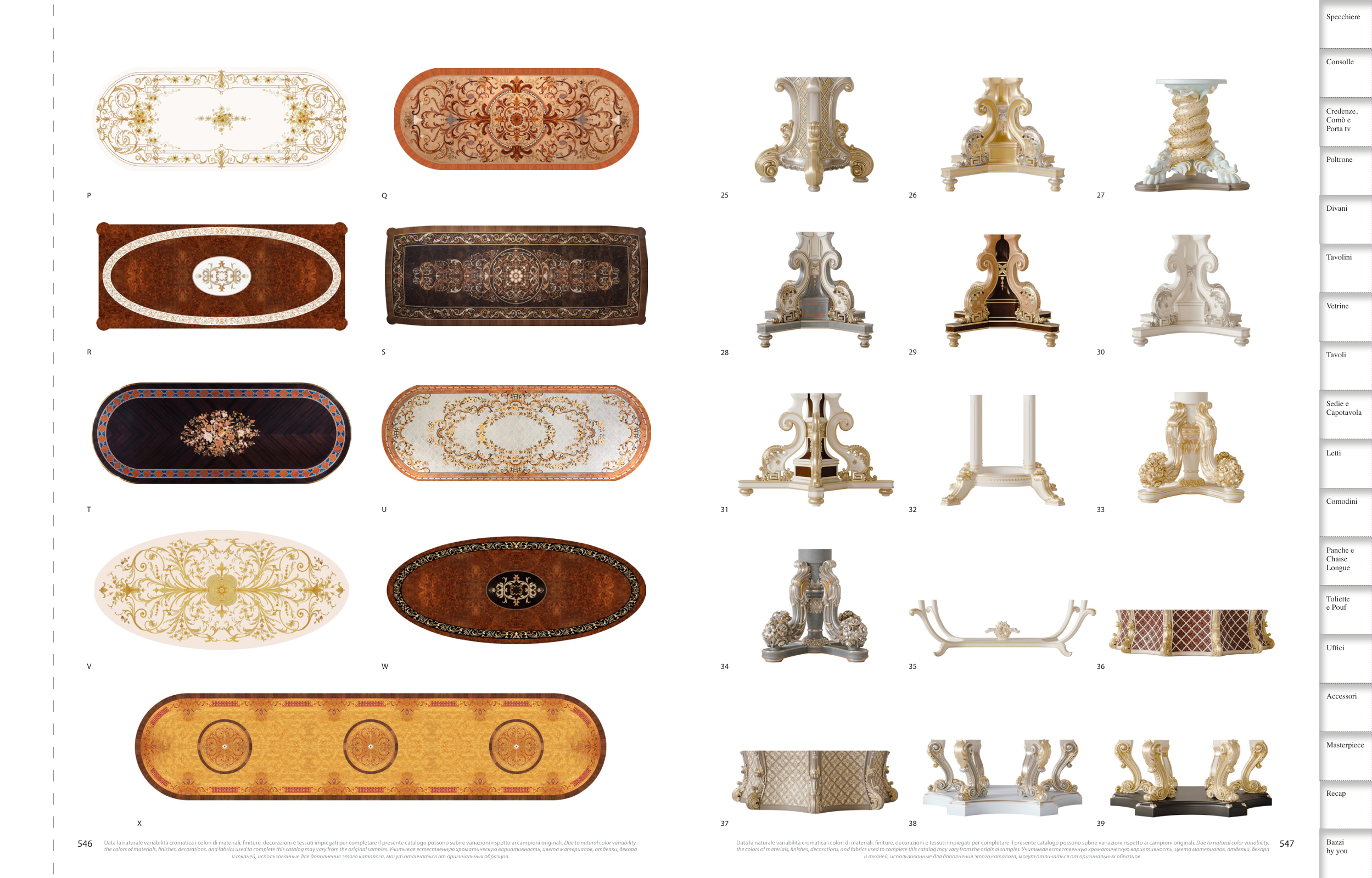 the colors of materials, fnishes, decorations, and fabrics used to complete this catalog may vary from the original samples. Учитывая естественную хроматическую вариативность, цвета материалов, отделки, декора