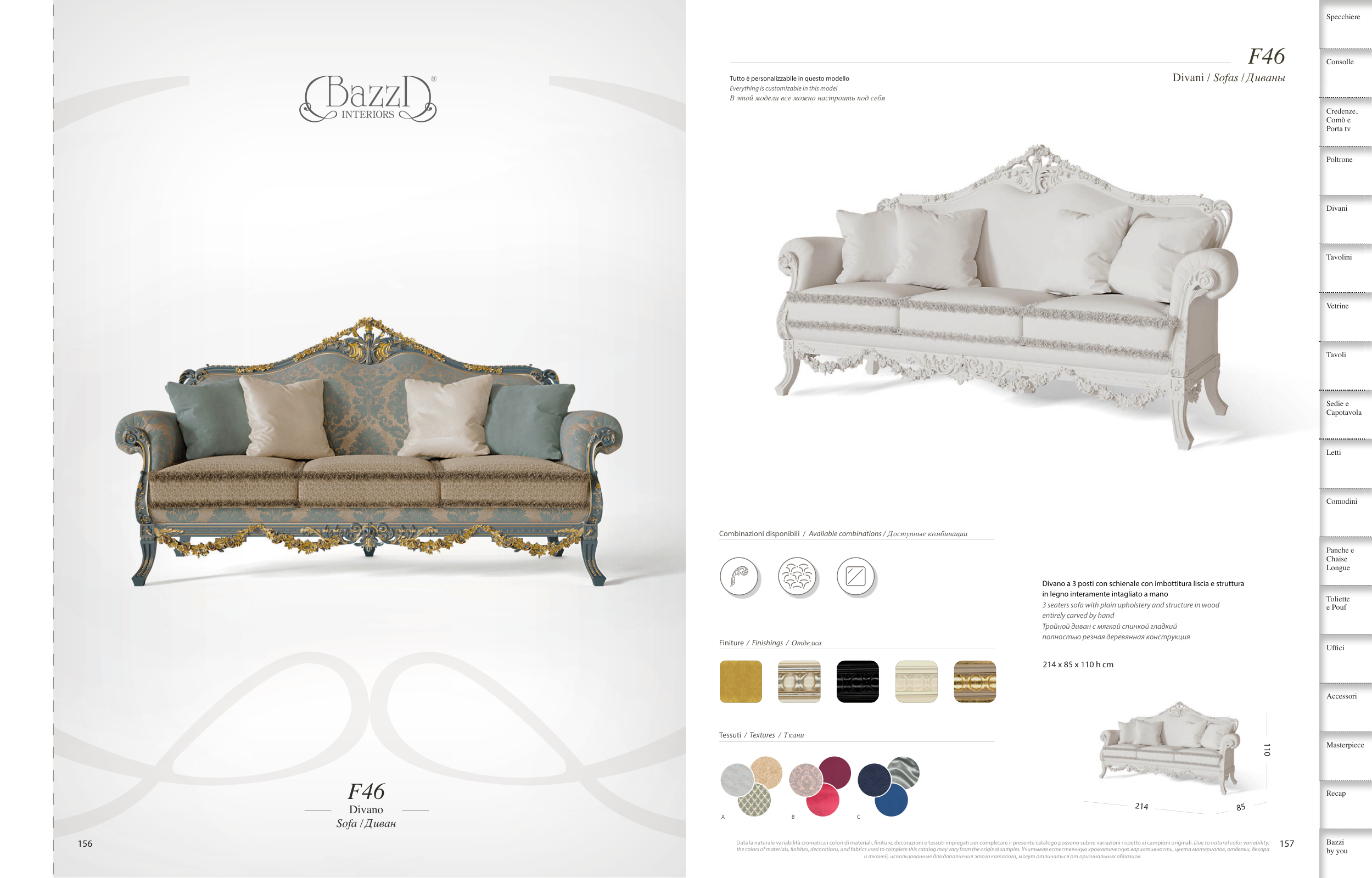the colors of materials, fnishes, decorations, and fabrics used to complete this catalog may vary from the original samples. Учитывая естественную хроматическую вариативность, цвета материалов, отделки, декора