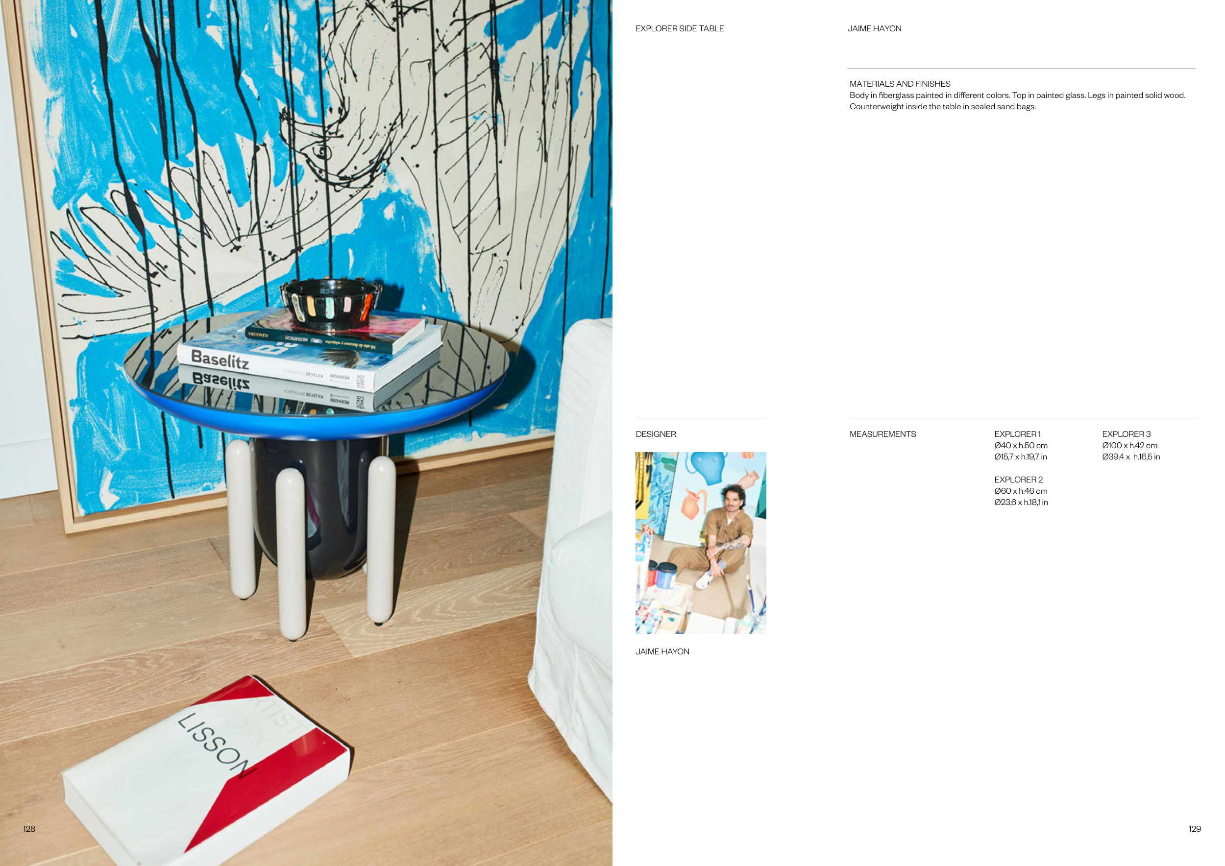Body in fiberglass painted in different colors. Top in painted glass. Legs in painted solid wood.