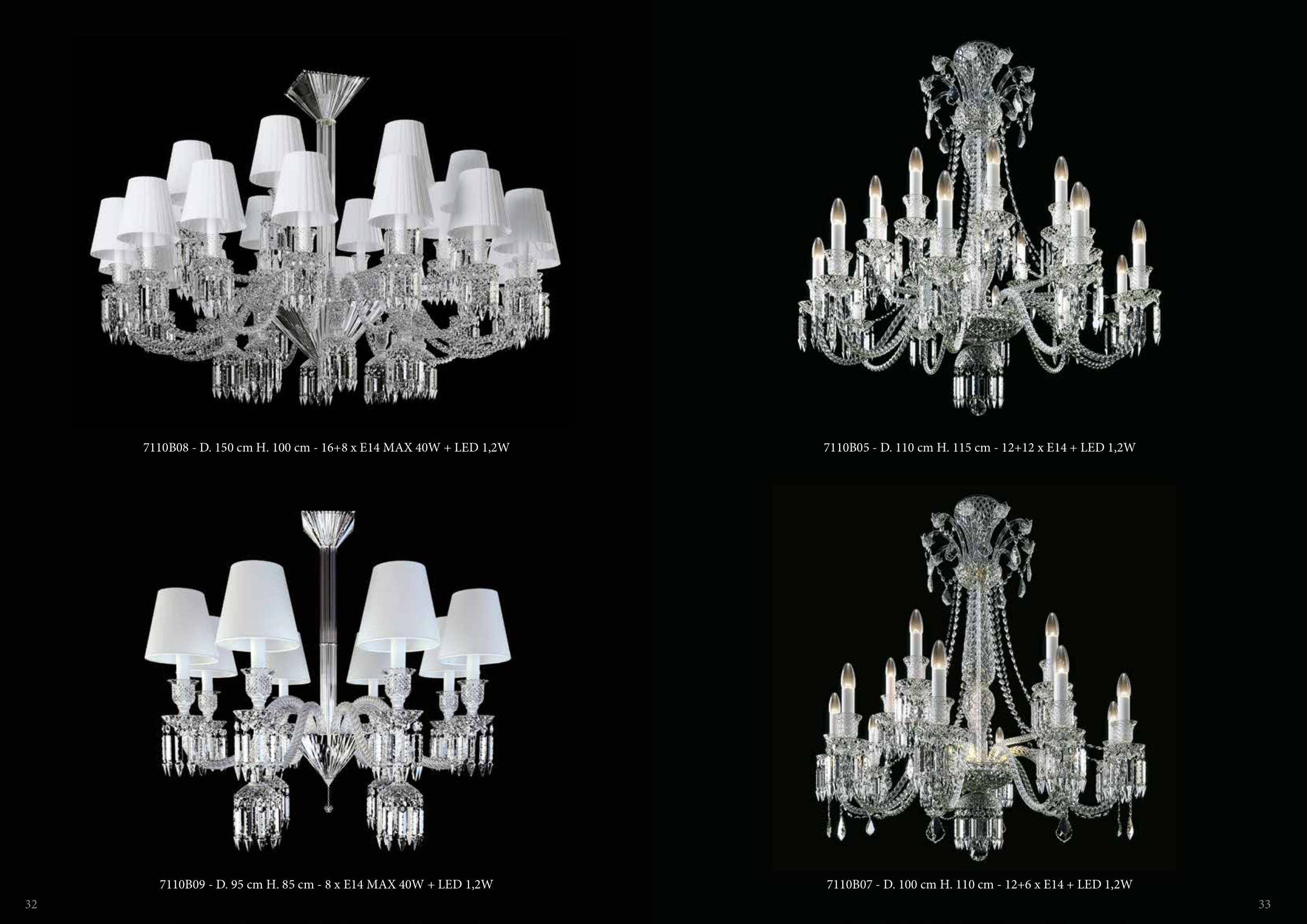7110B08 - D. 150 cm H. 100 cm - 16+8 x E14 MAX 40W + LED 1,2W 7110B07 - D. 100 cm H. 110 cm - 12+6 x E14 + LED 1,2W 7110B09 - D. 95 cm H. 85 cm - 8 x E14 MAX 40W + LED 1,2W 7110B05 - D. 110 cm H. 115 cm - 12+12 x E14 + LED 1,2W 32 33