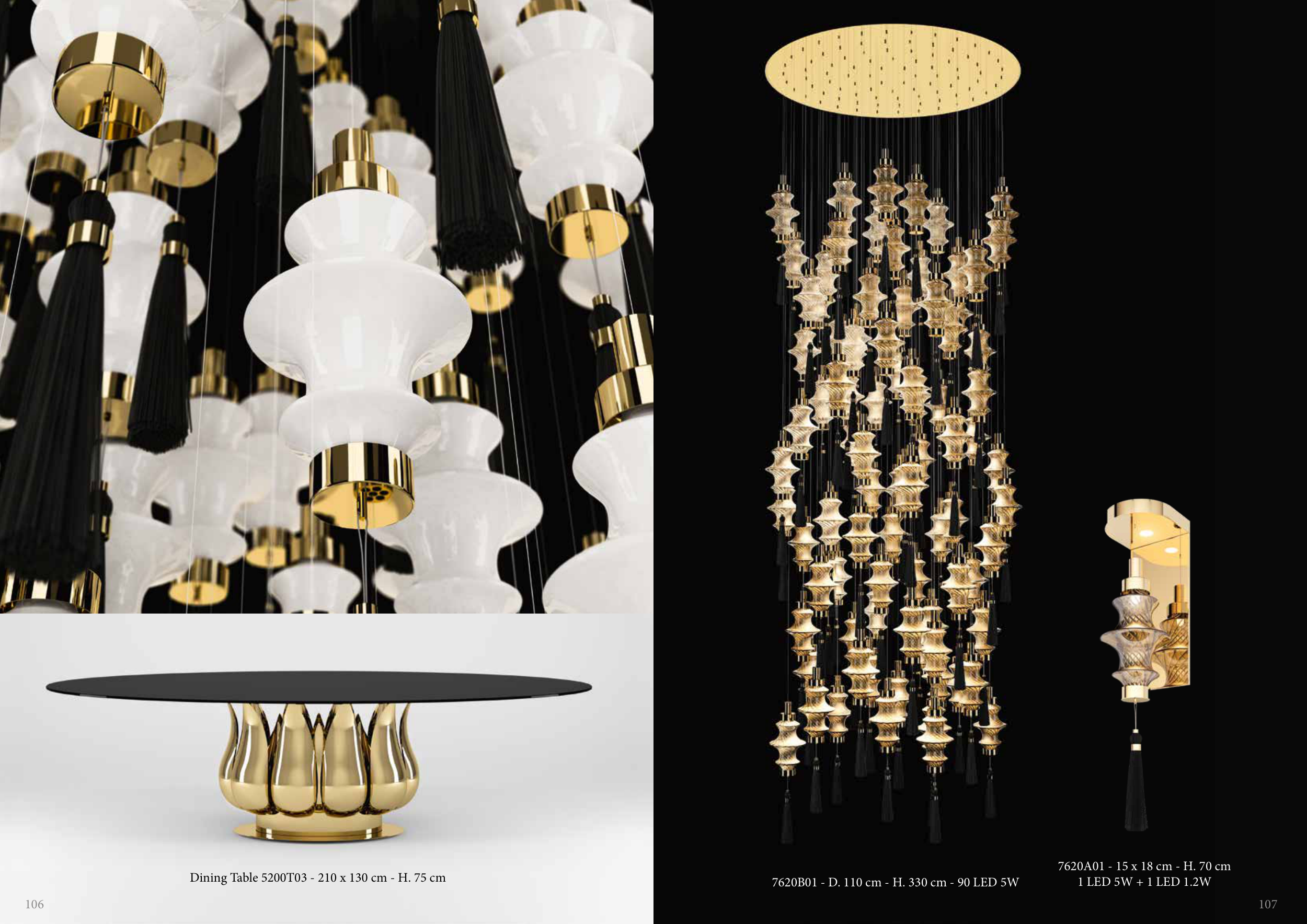 Dining Table 5200T03 - 210 x 130 cm - H. 75 cm 7620B01 - D. 110 cm - H. 330 cm - 90 LED 5W 7620A01 - 15 x 18 cm - H. 70 cm 1 LED 5W + 1 LED 1.2W 106 107