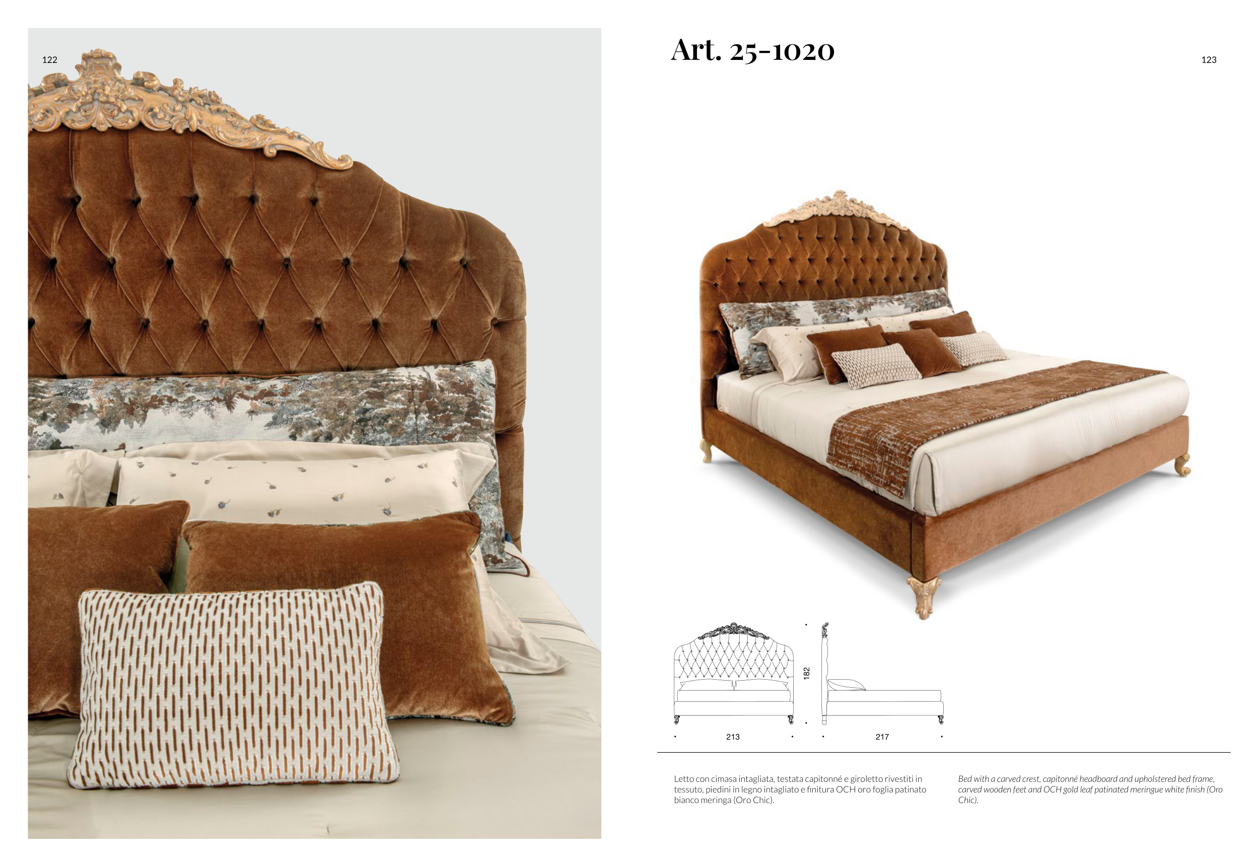tessuto, piedini in legno intagliato e finitura OCH oro foglia patinato